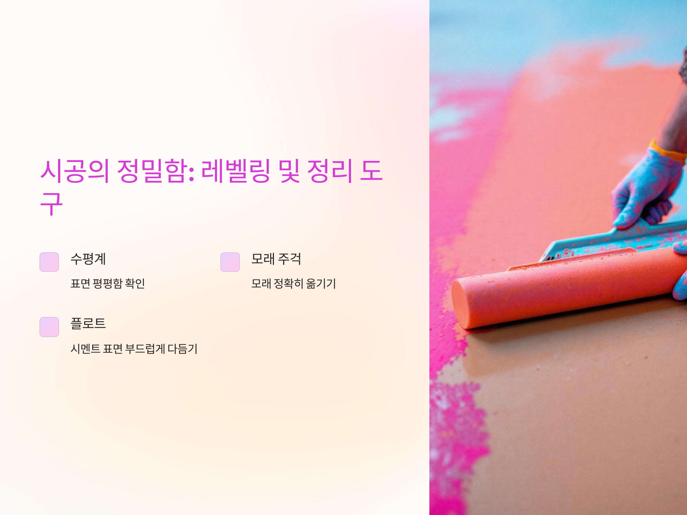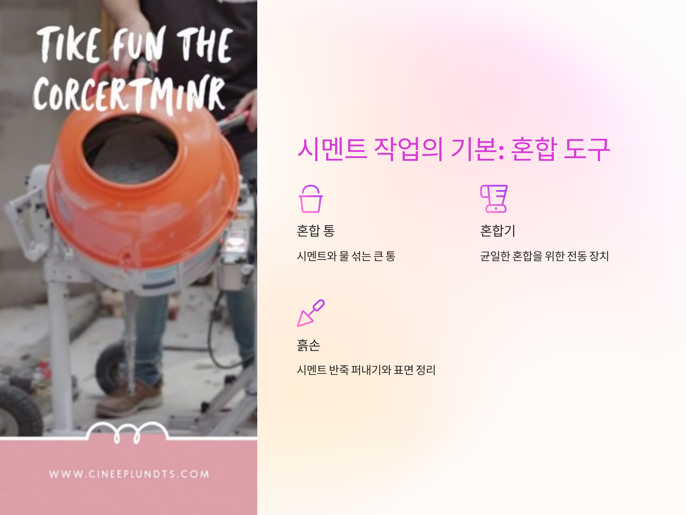 시멘트 작업을 성공적으로 수행하기 위해서는 올바른 도구 선택과 정확한 사용이 중요합니다. 각 도구의 목적을 이해하고 적절히 활용하면 작업의 효율성과 결과를 극대화할 수 있습니다. 이 글에서 소개한 도구와 팁을 활용해 더 나은 작업 결과를 만들어 보세요.
