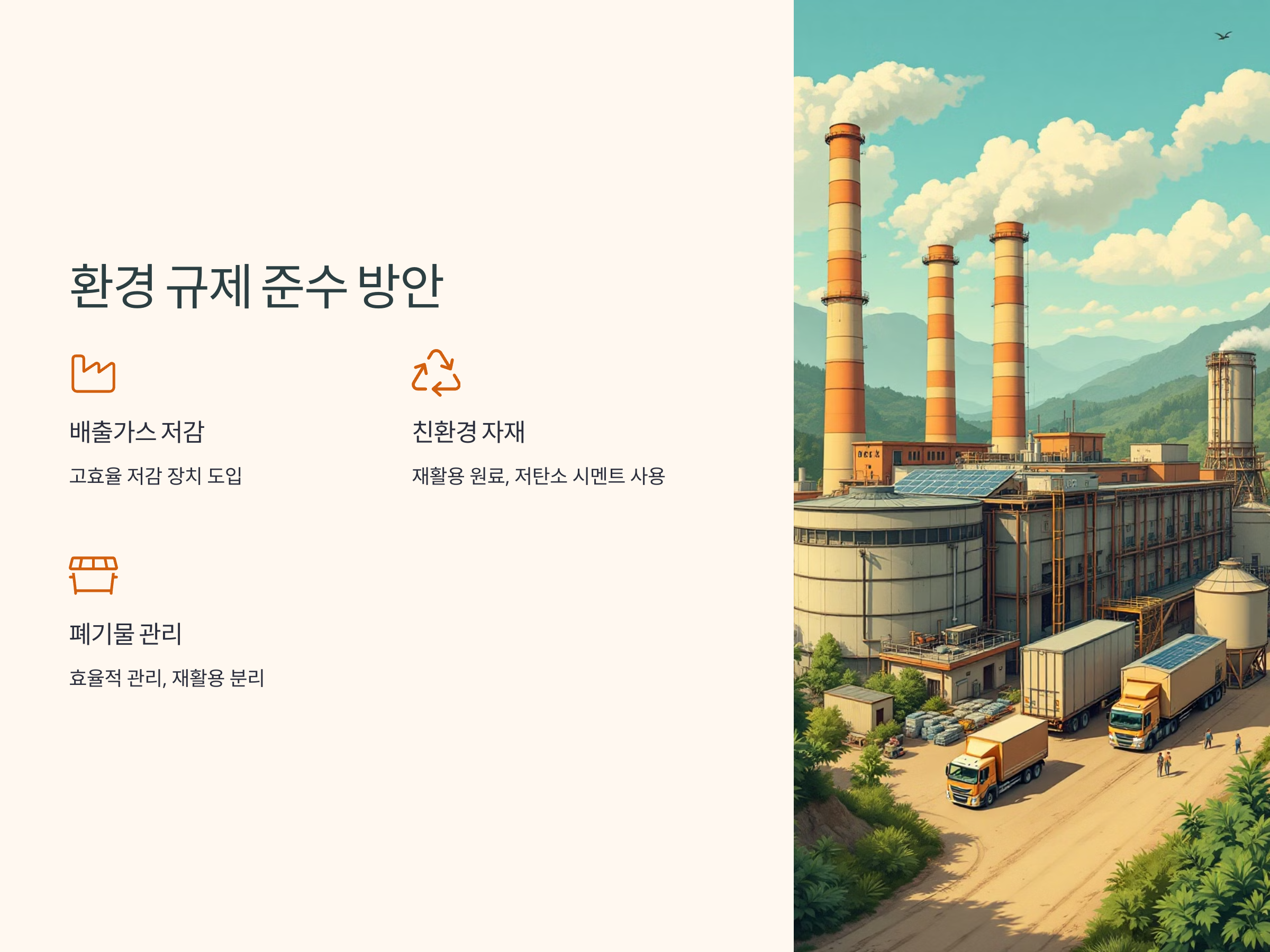 - 배출가스 저감 장치 설치: 시멘트 제조 과정에서 발생하는 온실가스 배출을 줄이기 위해 고효율 배출가스 저감 장치를 도입해야 합니다.