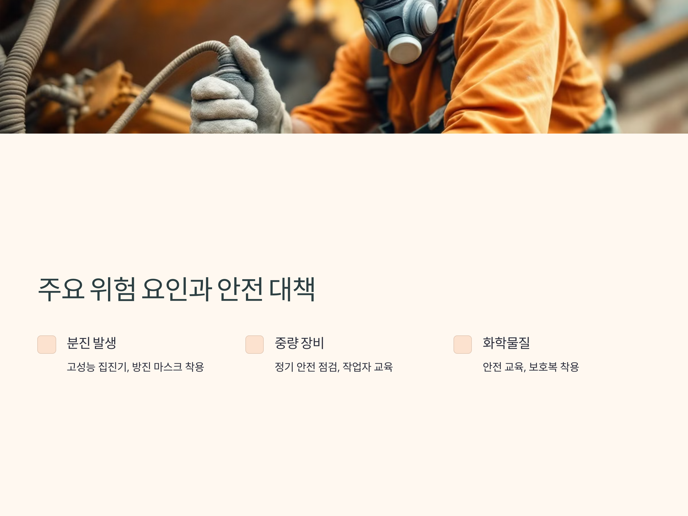 이외에도 작업 현장의 조도, 통풍 시스템 개선 등을 통해 안전성을 높일 수 있습니다.