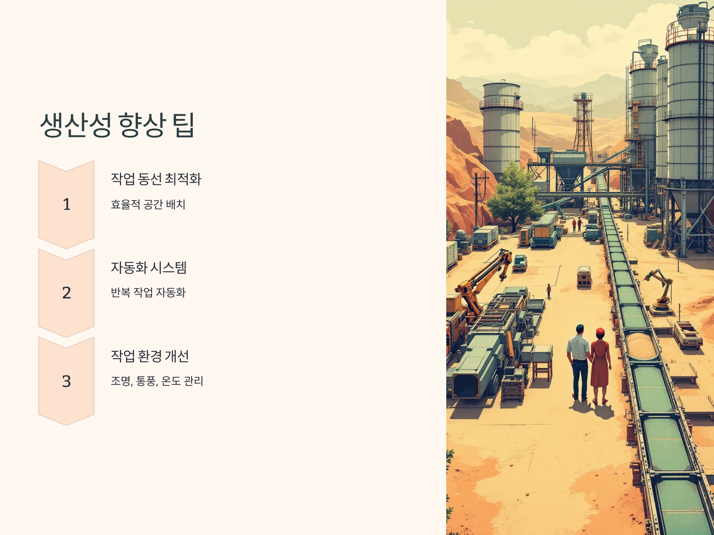 - 자동화 시스템 도입: 자재 운반, 혼합 등 반복 작업에 자동화 시스템을 도입하면 작업 속도와 품질이 향상됩니다.
