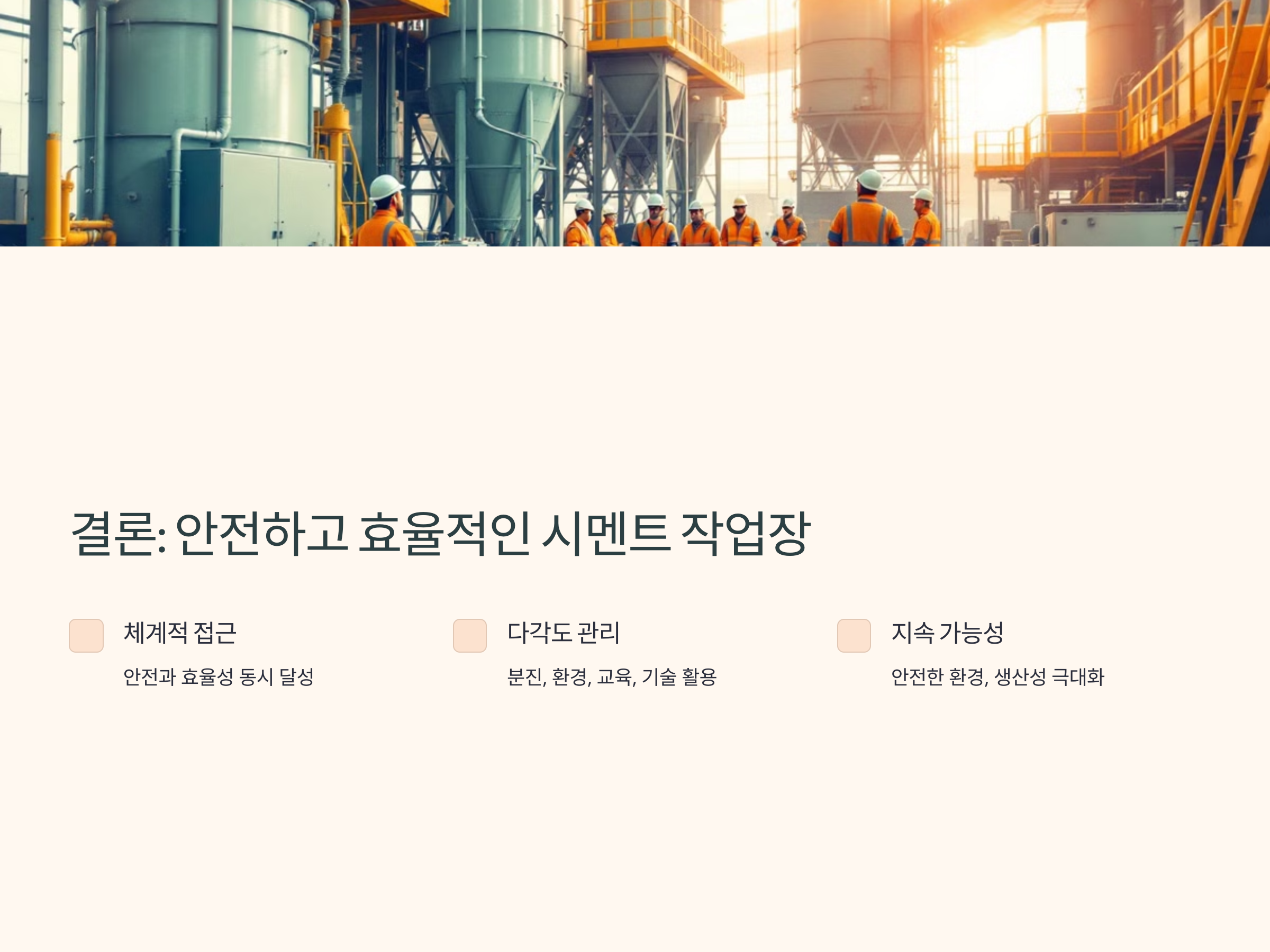 시멘트 작업장의 관리는 안전과 효율성을 동시에 달성해야 하는 중요한 과제입니다. 분진 관리, 환경 규제 준수, 작업자 교육, 최신 기술 활용 등 다양한 측면에서 체계적인 접근이 필요합니다. 이를 통해 안전하고 지속 가능한 작업 환경을 조성하고, 생산성을 극대화할 수 있습니다.