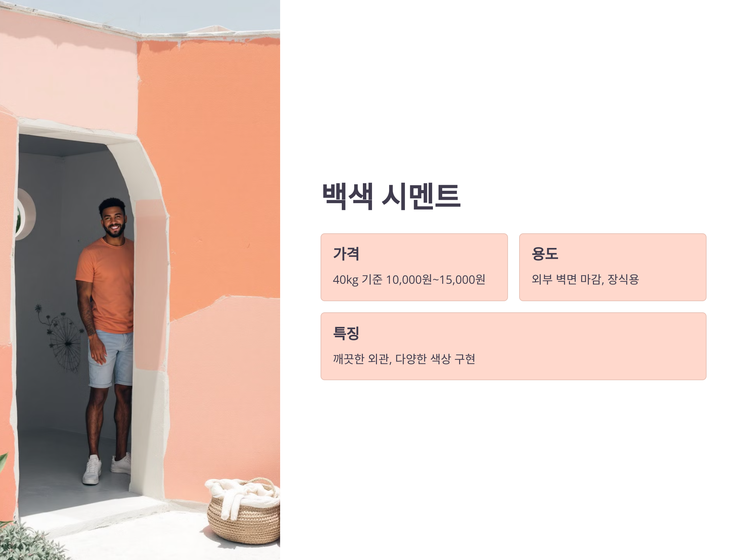 백색 시멘트는 미적인 요소가 중요한 공사에 적합하며, 외부 벽면 마감이나 장식용으로 활용됩니다. 가격은 40kg 기준 10,000원~15,000원으로 다른 시멘트보다 높은 편입니다.