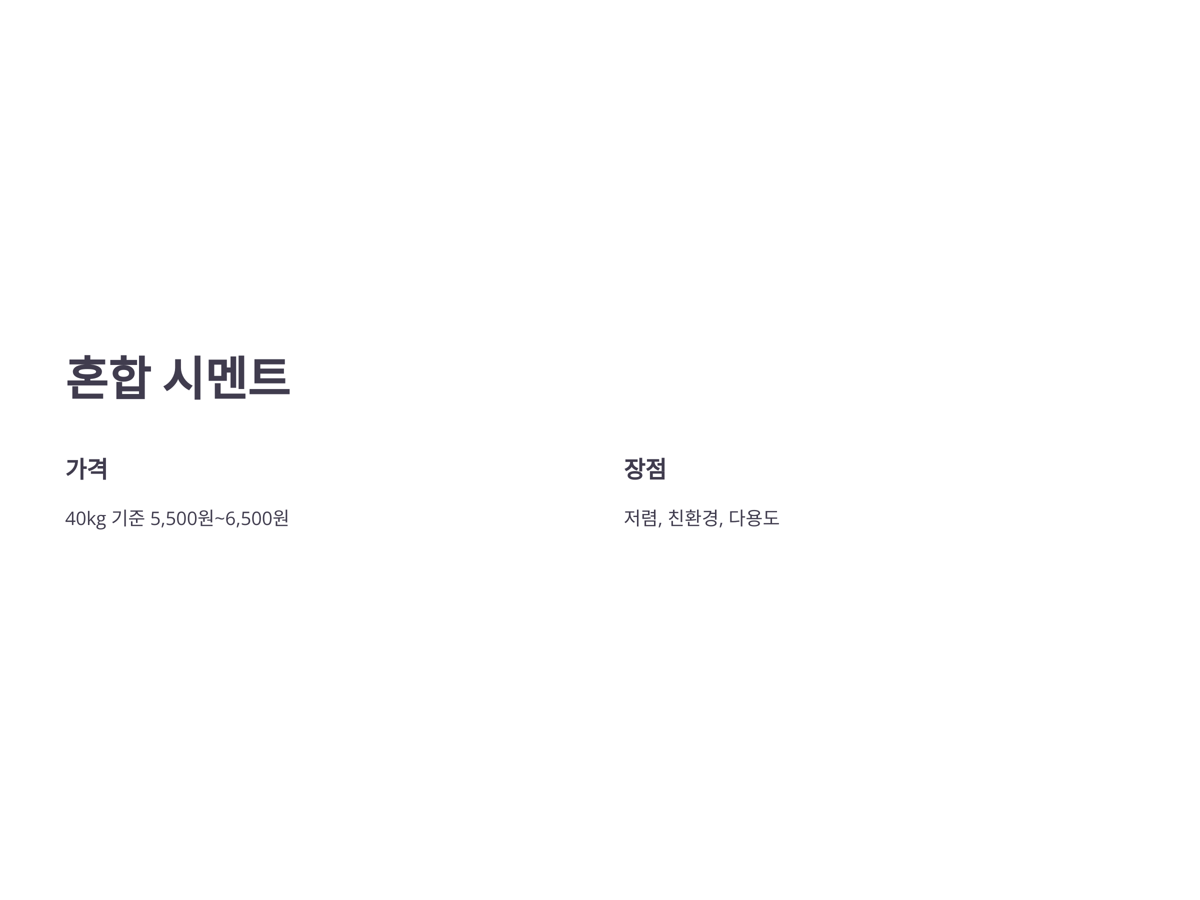혼합 시멘트는 슬래그, 플라이애시 등 산업 부산물을 활용하여 제조되며, 환경 친화적인 건축을 추구하는 프로젝트에 적합합니다. 가격은 포틀랜드 시멘트보다 약간 저렴하여, 5,500원~6,500원 선에서 구매 가능합니다.
