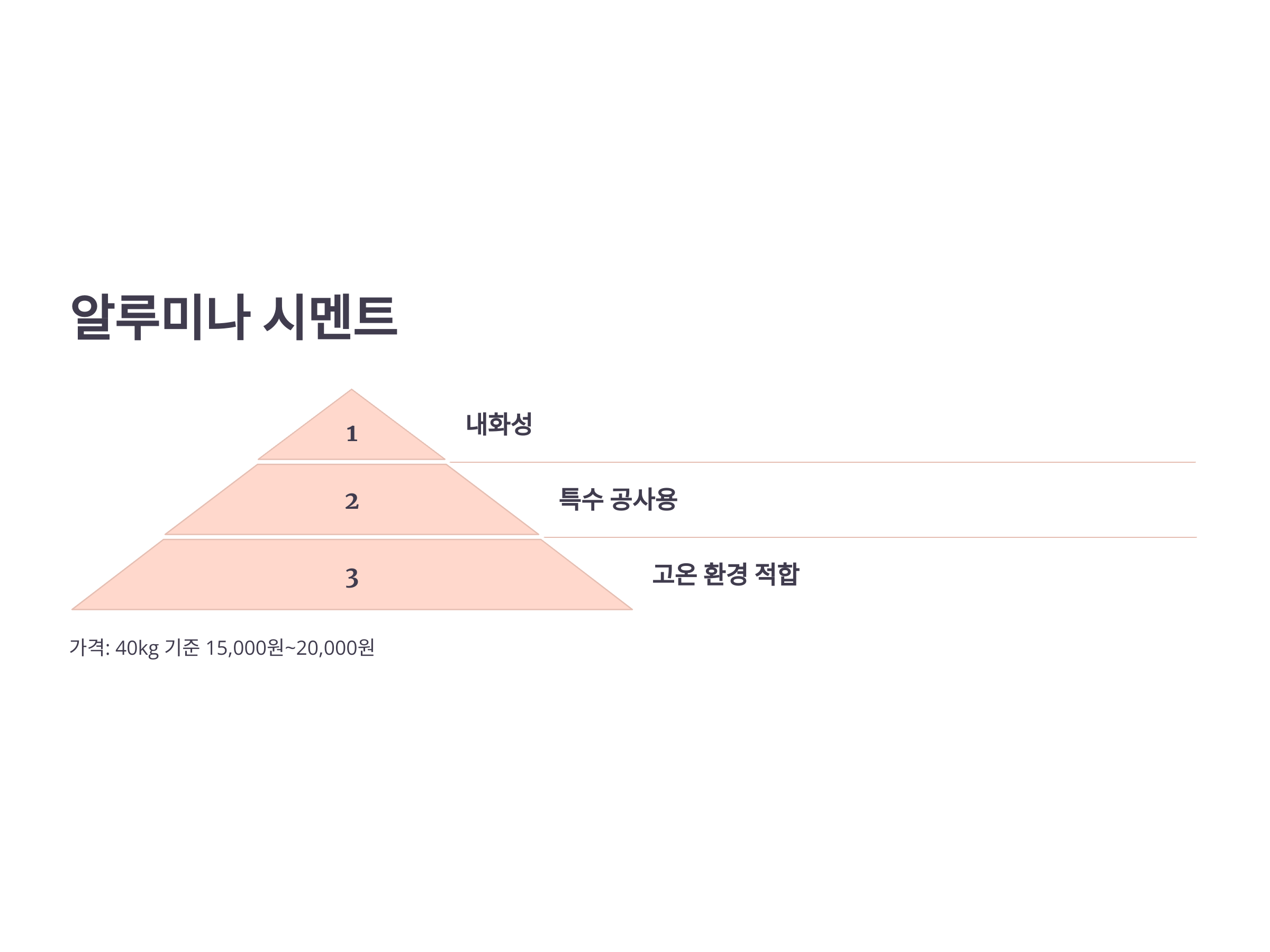 알루미나 시멘트는 내화성이 뛰어나 고온 환경에서도 강도를 유지할 수 있습니다. 가격은 40kg 기준 15,000원~20,000원으로 고가에 속합니다. 주요 특징은 다음과 같습니다: