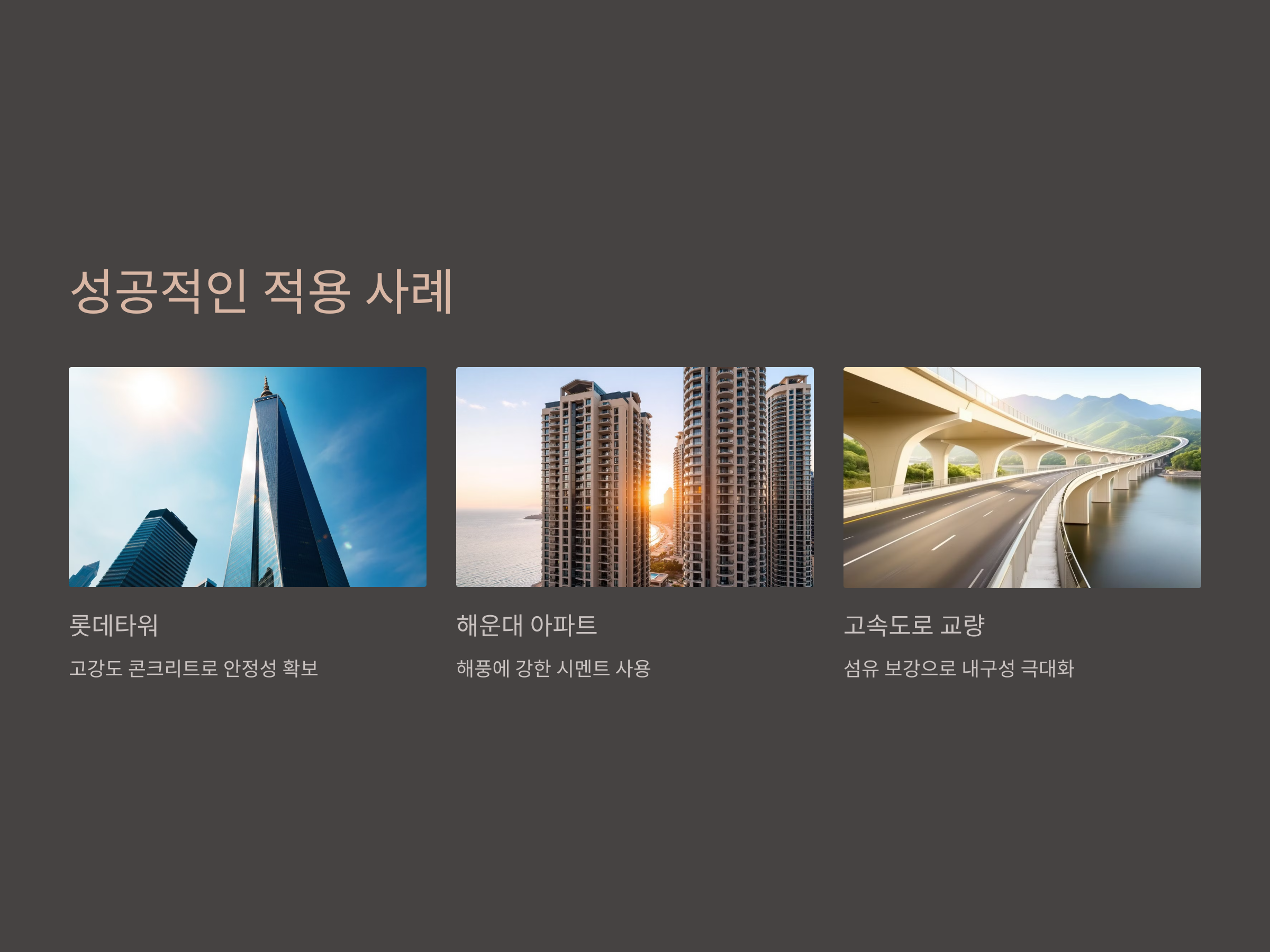 - 부산 해운대 초고층 아파트: 해풍과 염분에 강한 시멘트로 내구성을 강화한 사례.