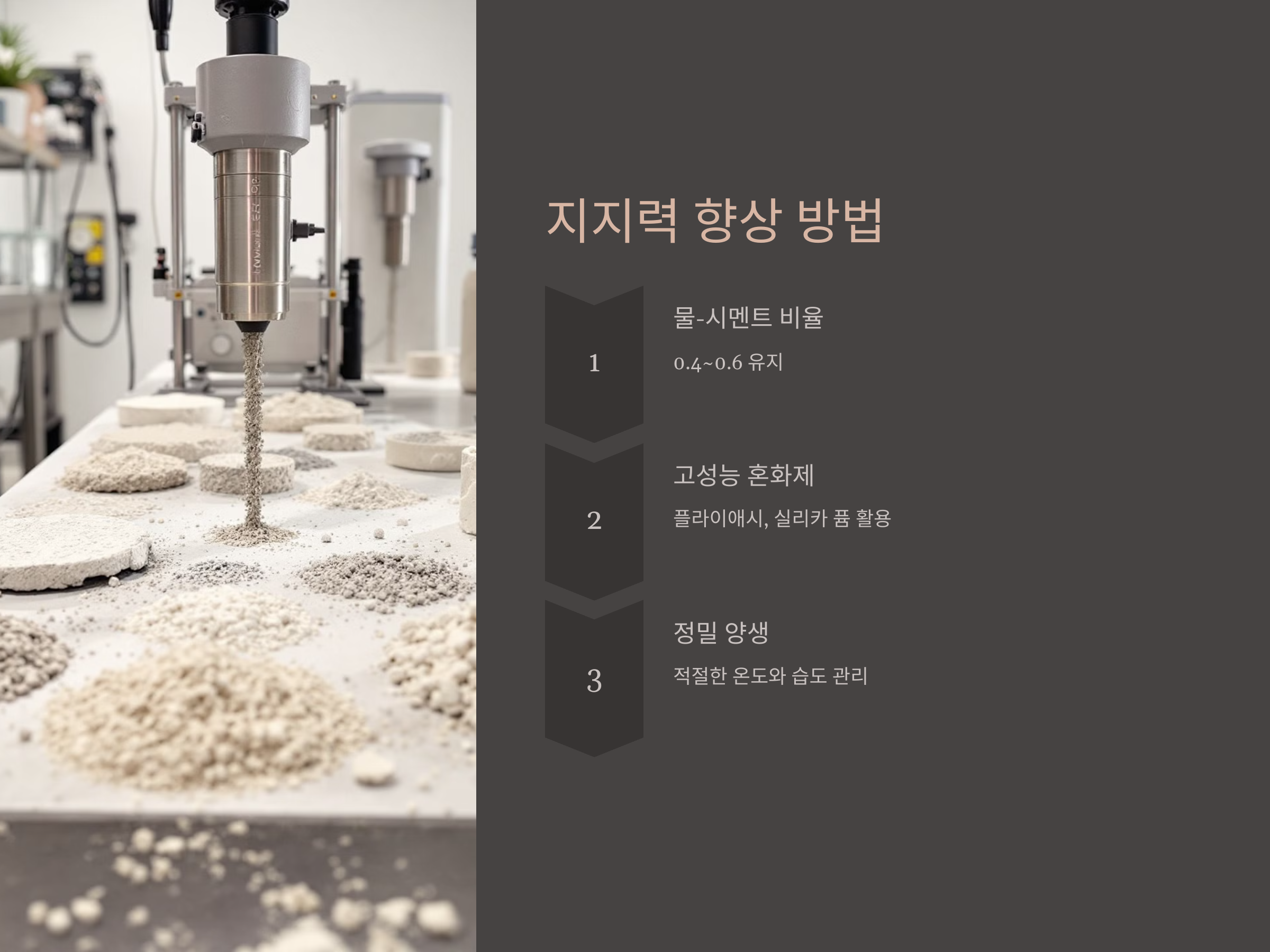 - 경기도 외곽 고속도로 교량: 고강도 시멘트와 섬유 보강을 통해 지지력과 내구성을 극대화.
