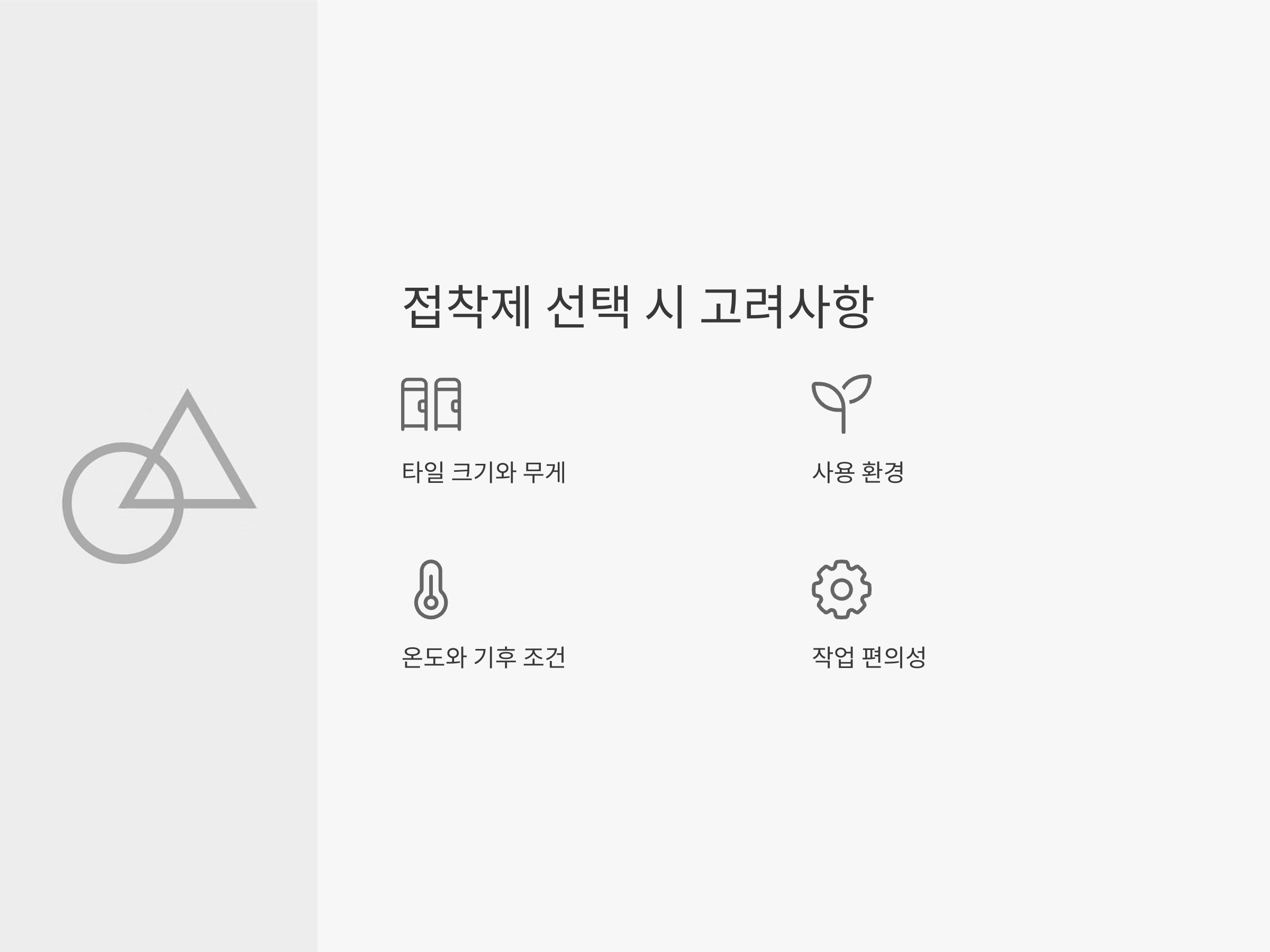 - 강력한 접착력: 타일이 쉽게 떨어지지 않도록 부착력을 제공합니다.