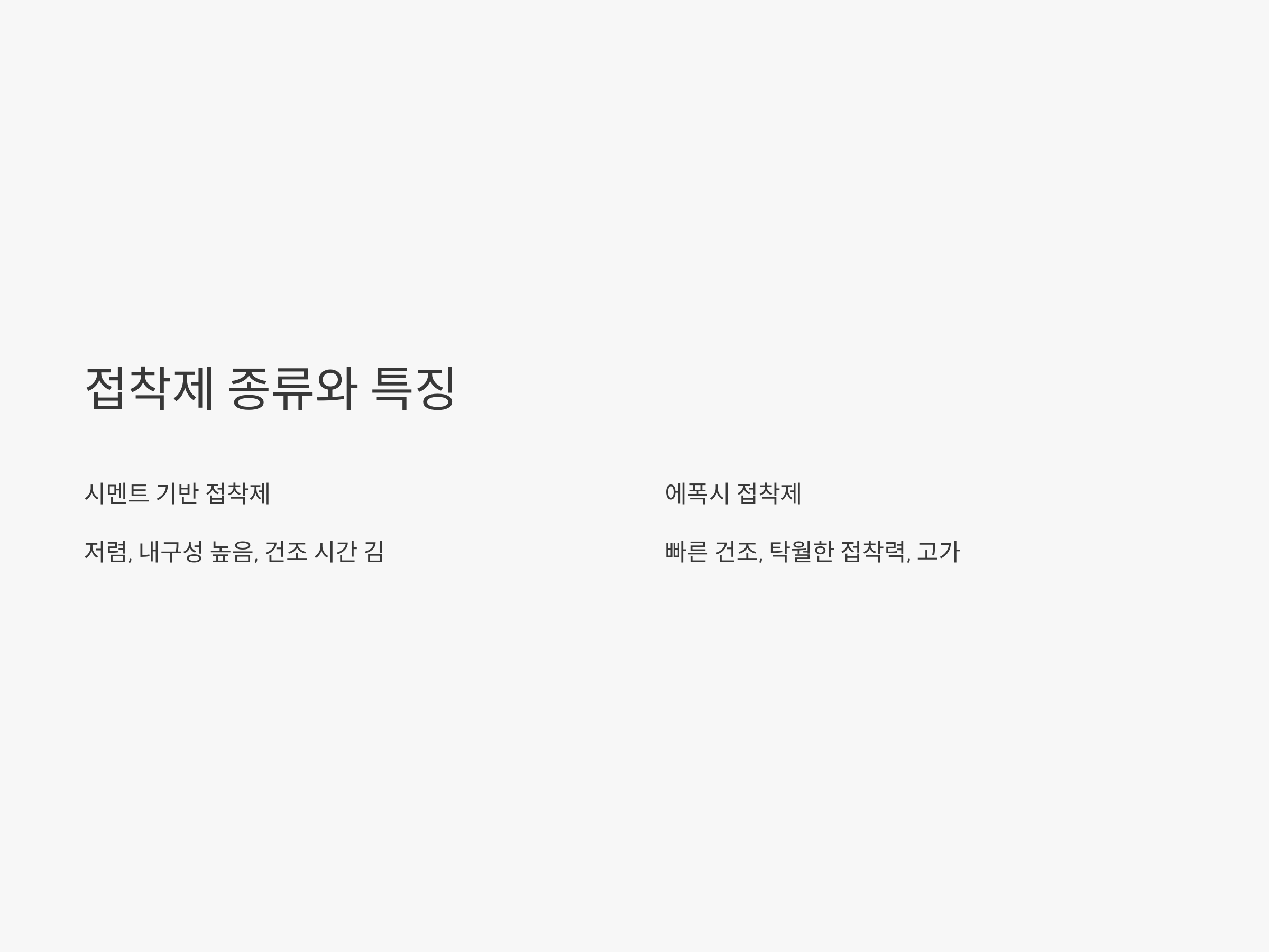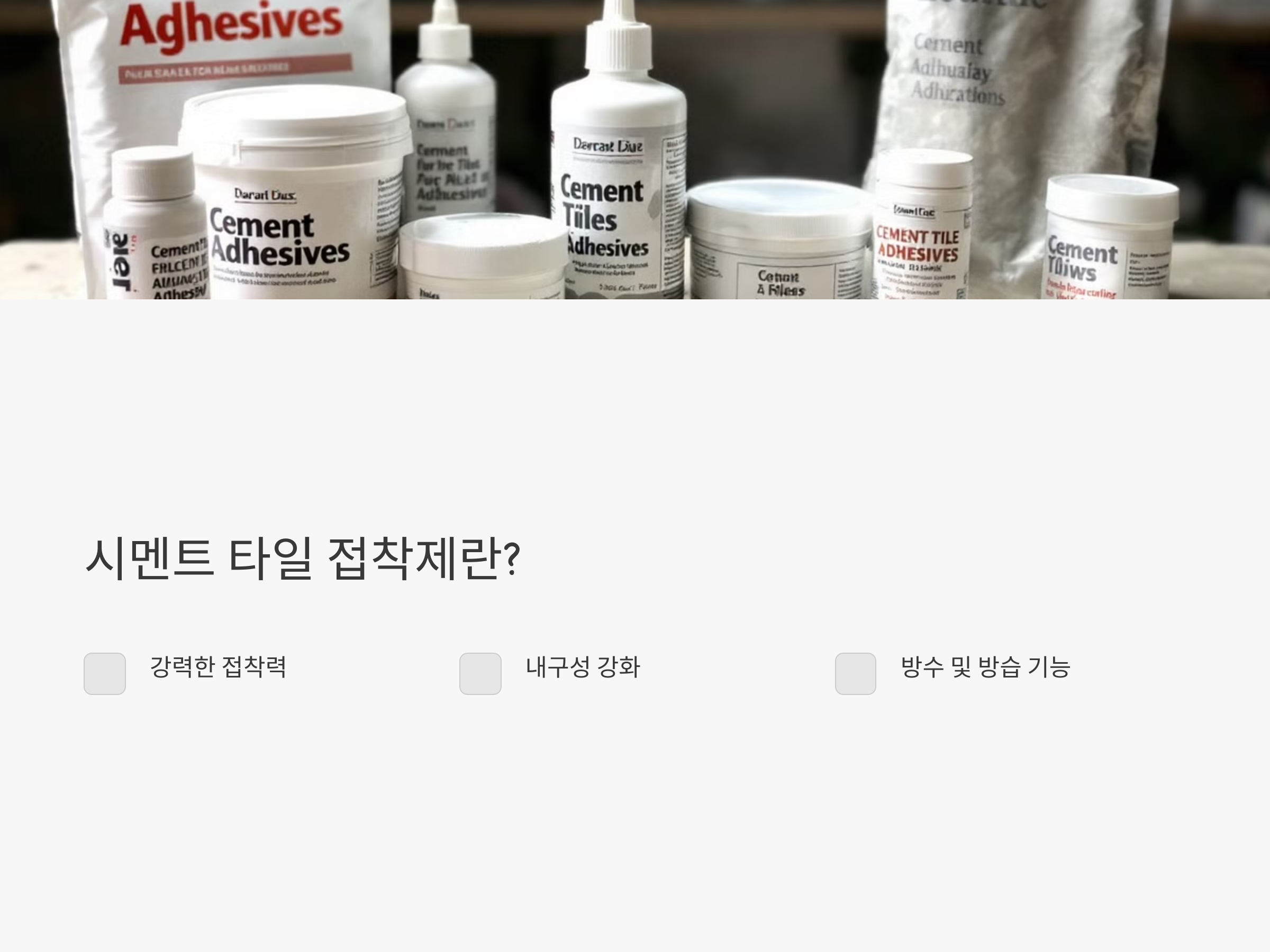 - 특징: 시멘트, 모래, 화학 첨가제를 혼합하여 제조된 접착제입니다.