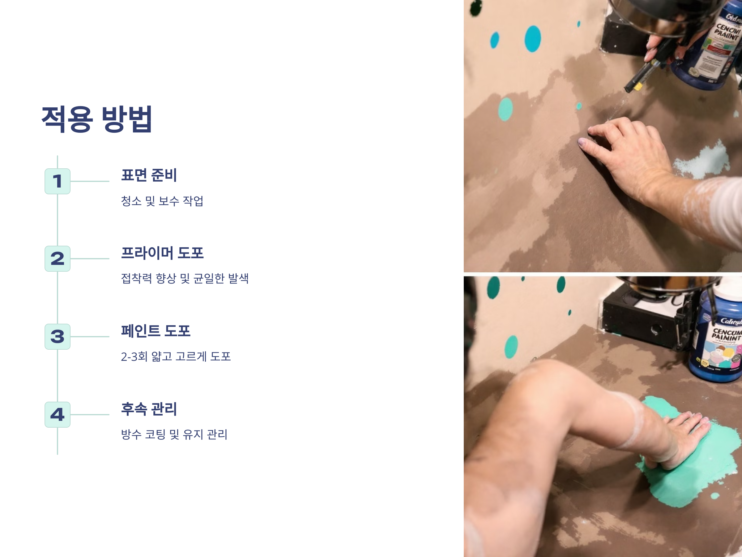 롤러나 브러시를 사용해 얇고 고르게 페인트를 도포하며, 최소 2~3회에 걸쳐 작업해야 합니다. 건조 시간도 충분히 확보하세요.