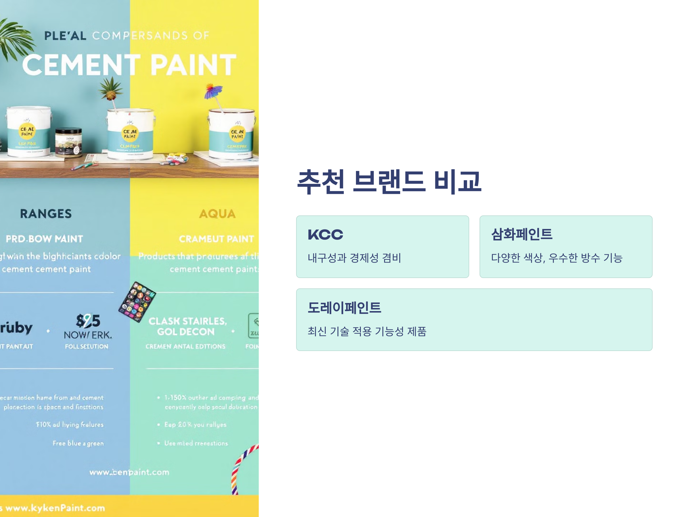 시멘트 페인트는 건축물의 내구성, 미관, 실용성을 동시에 향상시킬 수 있는 중요한 요소입니다. 정확한 정보와 트렌드를 바탕으로 최적의 제품을 선택하세요.