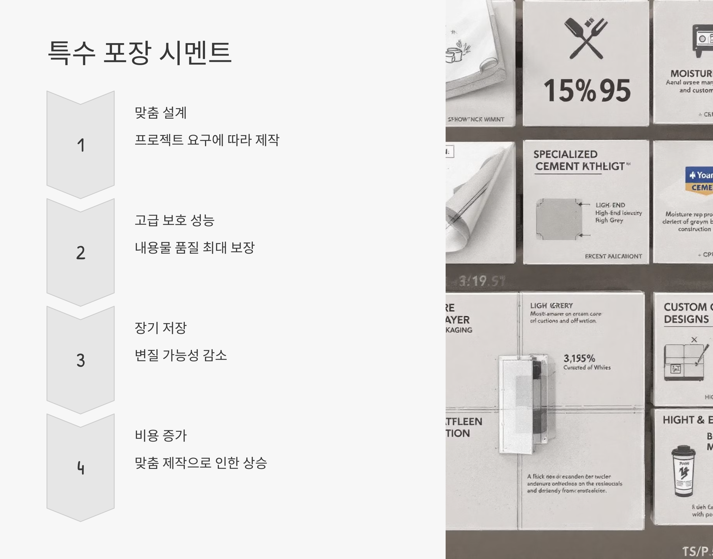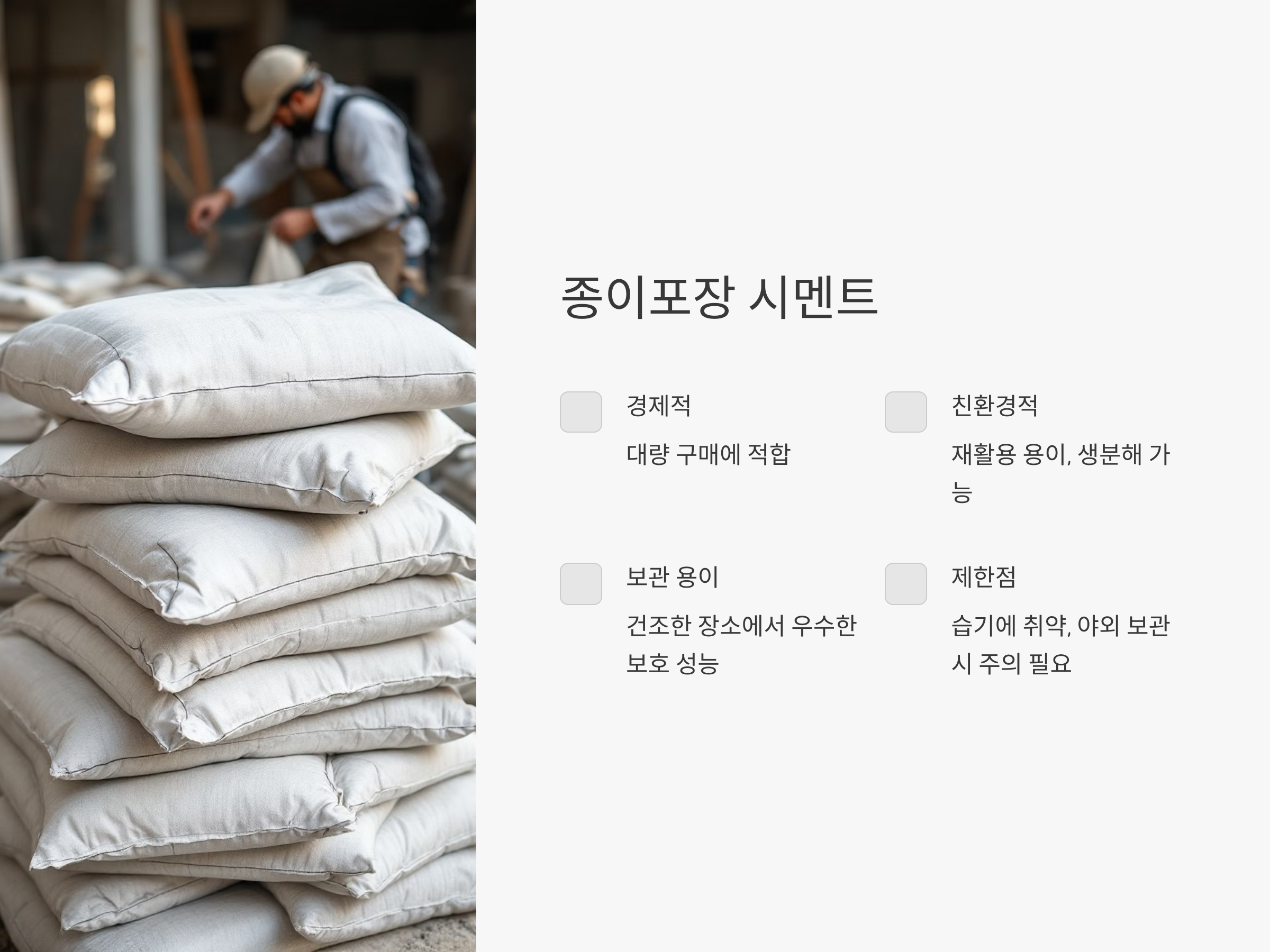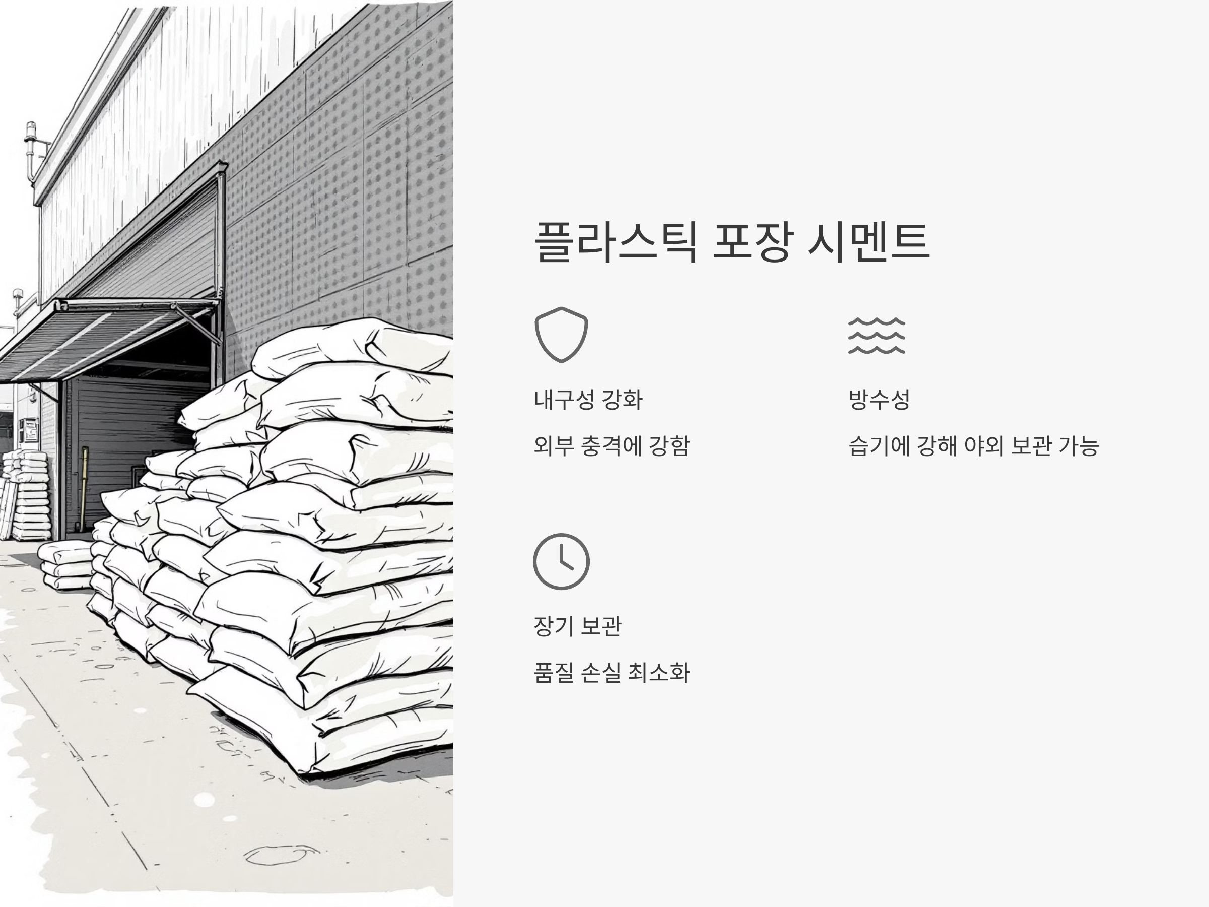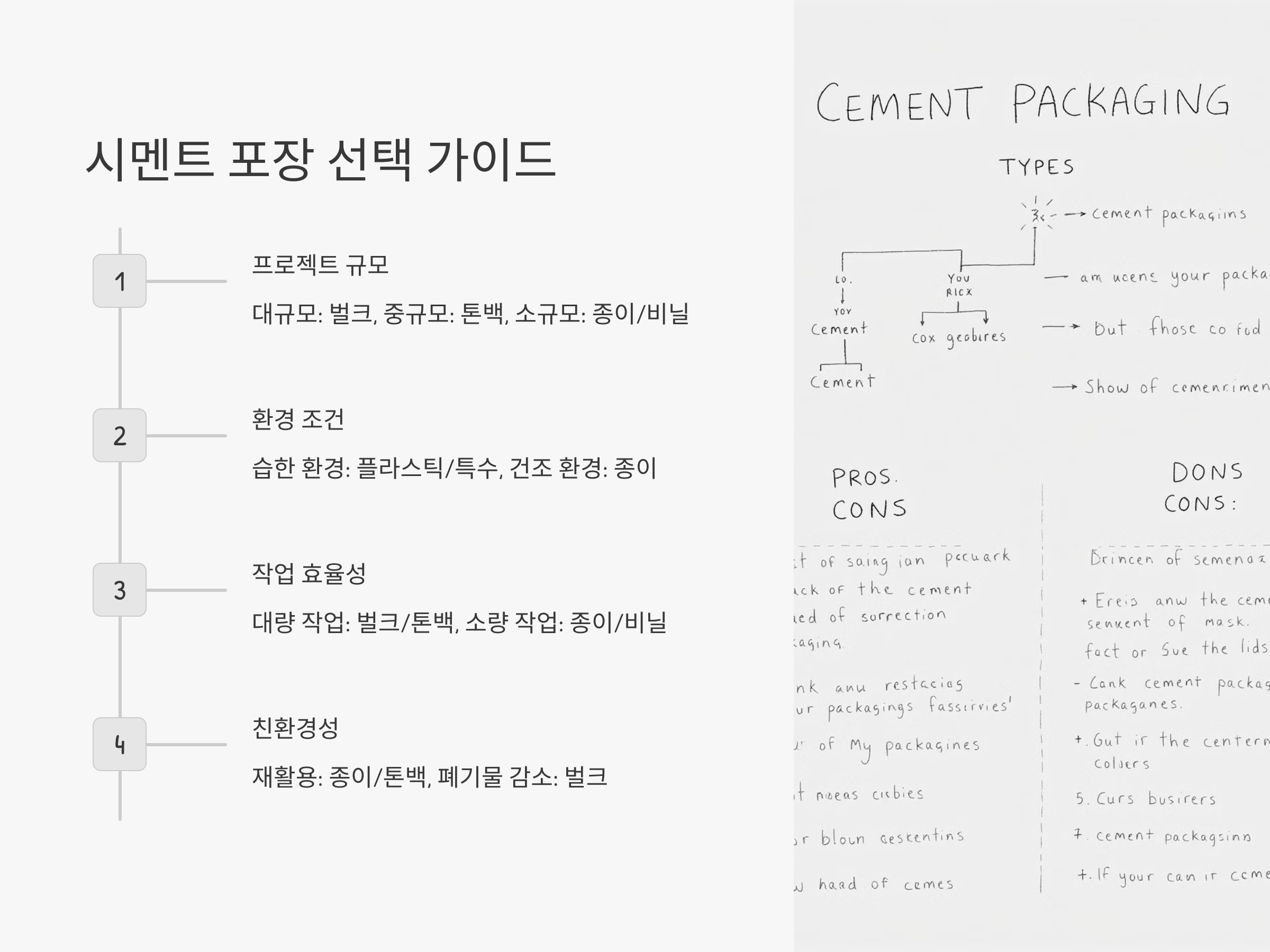 시멘트 포장은 프로젝트 규모, 환경 조건, 작업 효율성 등을 고려하여 선택해야 합니다. 종이포장은 경제적이고 친환경적이며, 플라스틱 포장은 방수와 내구성이 뛰어납니다. 벌크 포장은 대규모 작업에, 톤백은 중간 규모에 적합하며, 비닐 포장은 소규모 작업에 유리합니다. 특수 포장은 고급 프로젝트나 특수 조건에서 활용할 수 있습니다. 각 포장의 장단점을 이해하고 적합한 방식을 선택하면 작업 효율과 품질을 모두 향상시킬 수 있습니다.