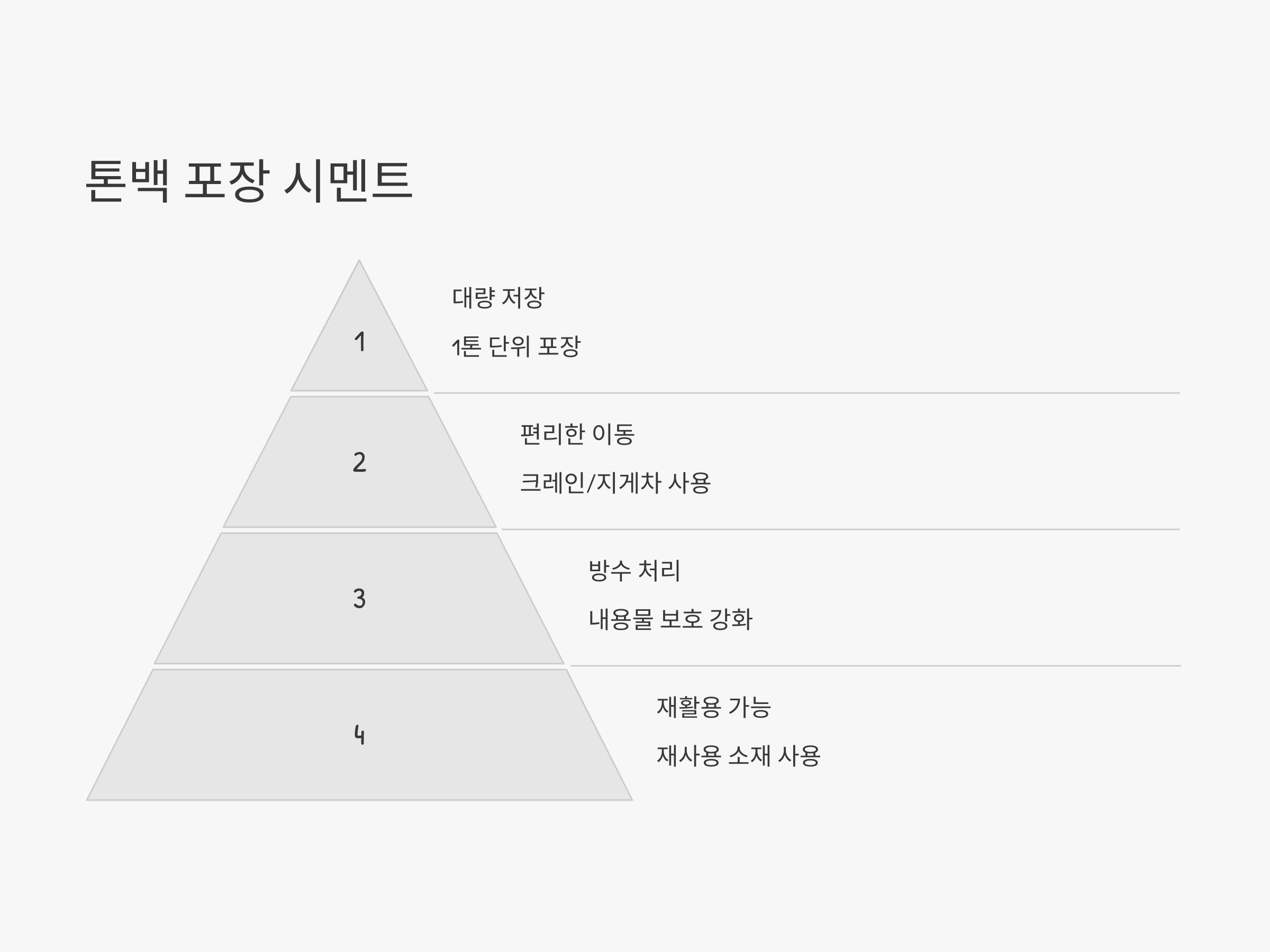 톤백 포장은 창고 보관 및 현장 사용 모두에 적합하며, 유연성이 높은 방법입니다.