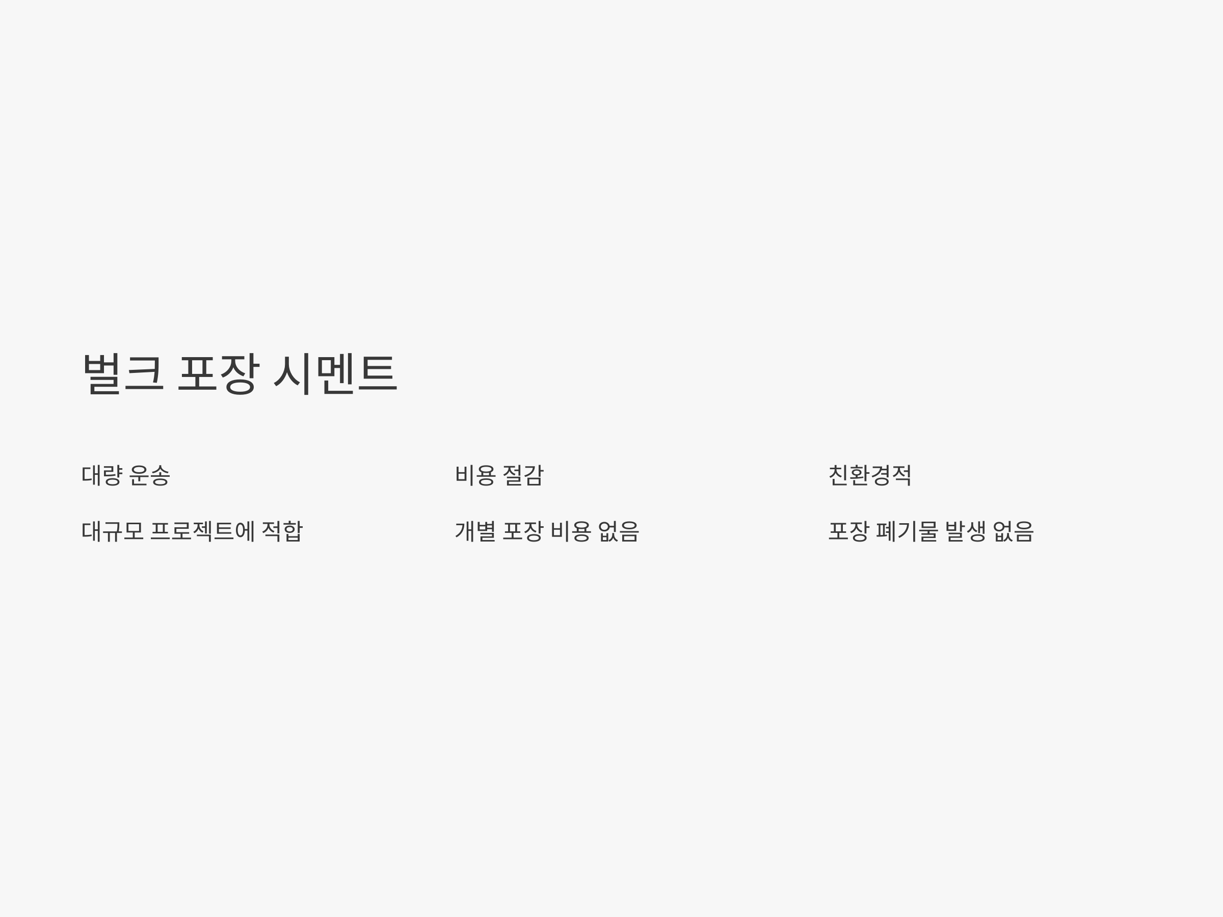 벌크 포장은 시멘트를 대량으로 운반하기 위한 방법으로, 대형 트럭이나 선박에 탱크 형태로 보관됩니다. 주요 특징은 다음과 같습니다: