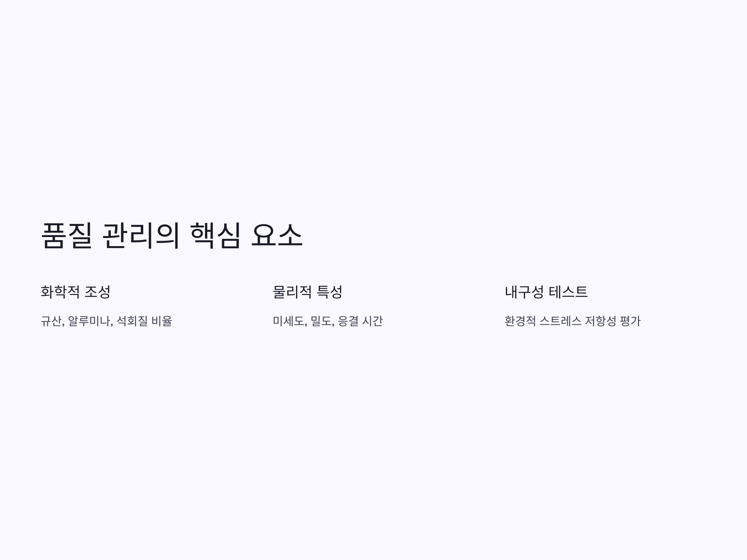 품질 검사는 제조 단계, 저장 단계, 그리고 현장 적용 단계에서 각각 이루어져야 합니다. 특히 제조 단계에서는 XRF/XRD 분석과 같은 첨단 기법을 활용하여 화학 성분을 정밀 분석합니다.