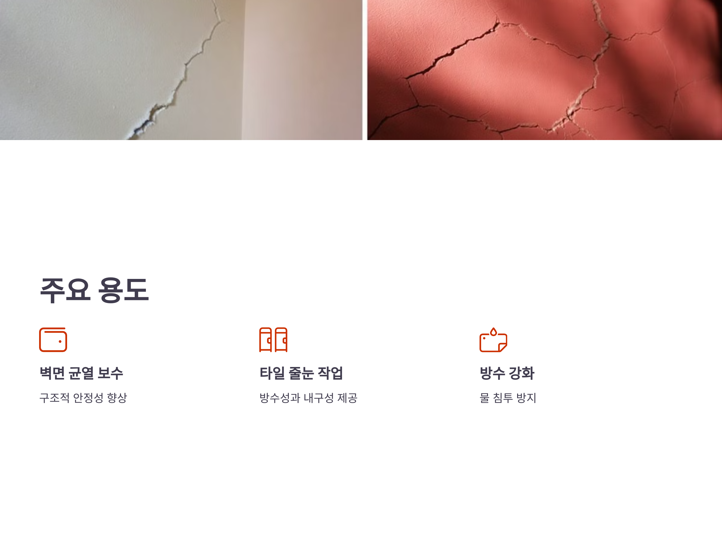 외벽에 생긴 손상 부위에 사용해 건축물의 외관과 구조적 무결성을 동시에 유지할 수 있습니다.