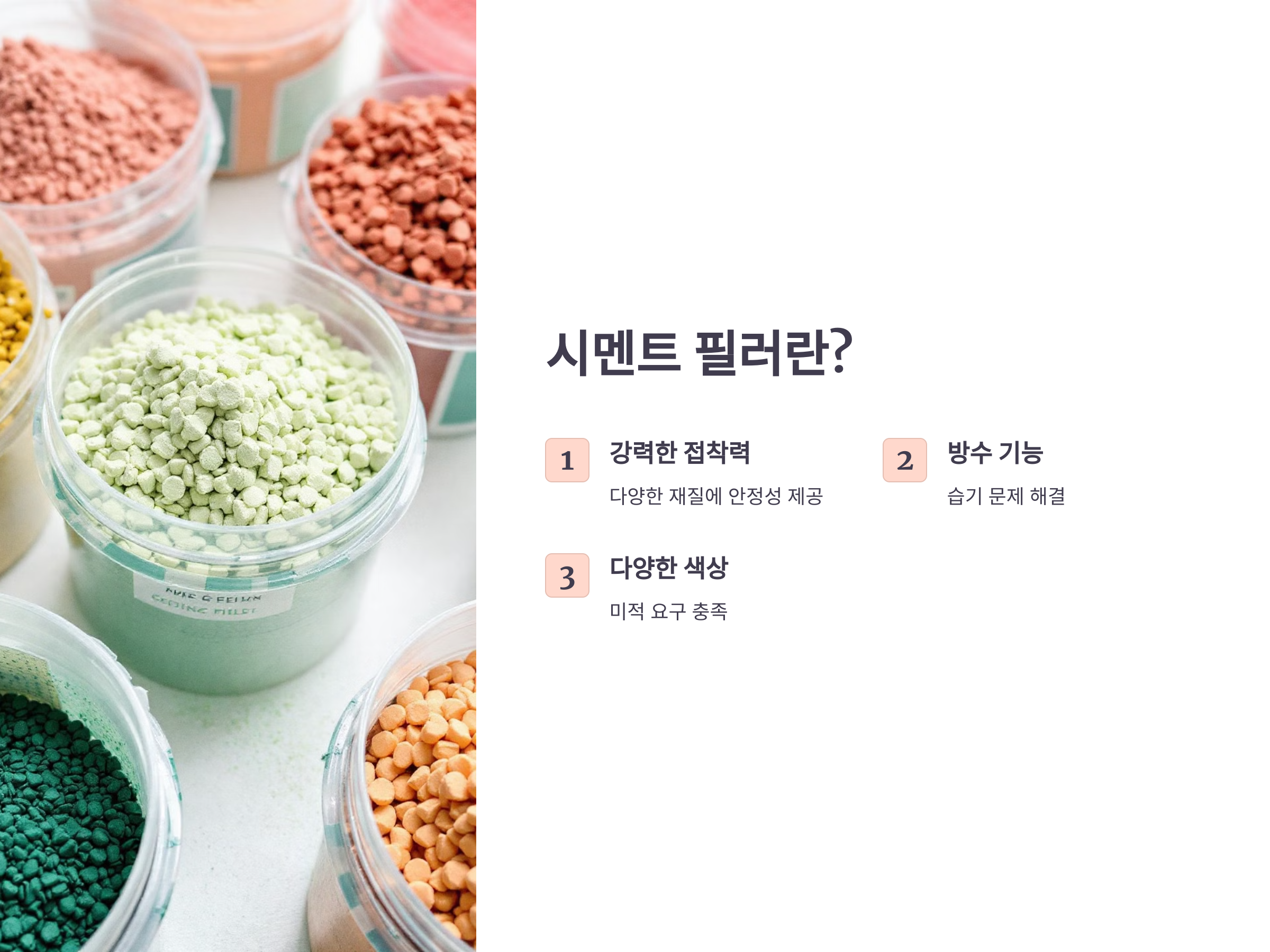 시멘트 필러는 주로 시멘트를 기반으로 제작된 충전재로, 벽면 균열, 틈새, 바닥과 타일 사이를 메우는 데 사용됩니다. 주로 아래와 같은 특징이 있습니다: