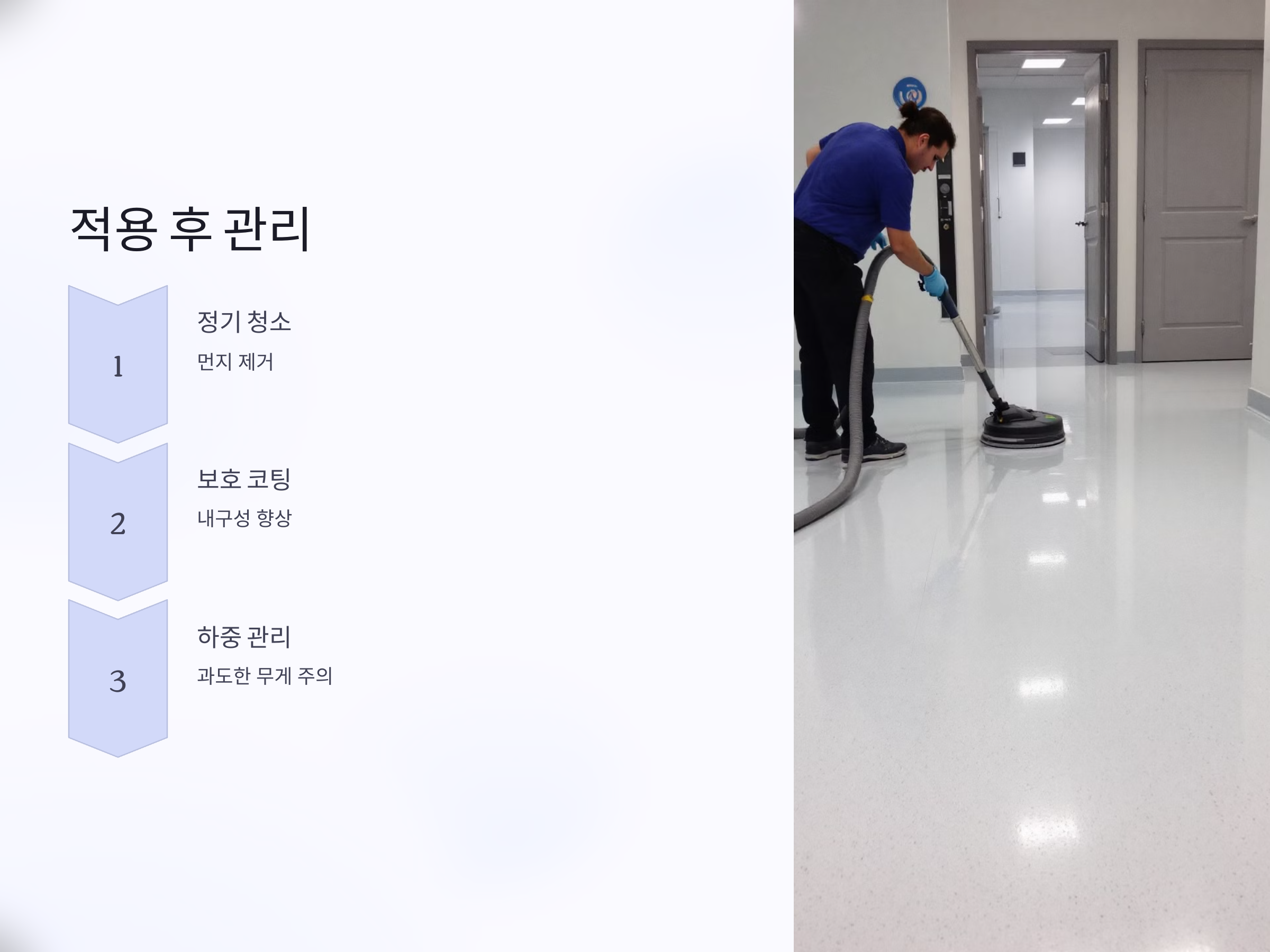 - 최종 마감: 완전히 건조된 후 바닥을 진공 청소기로 청소하거나 폴리싱 처리합니다.