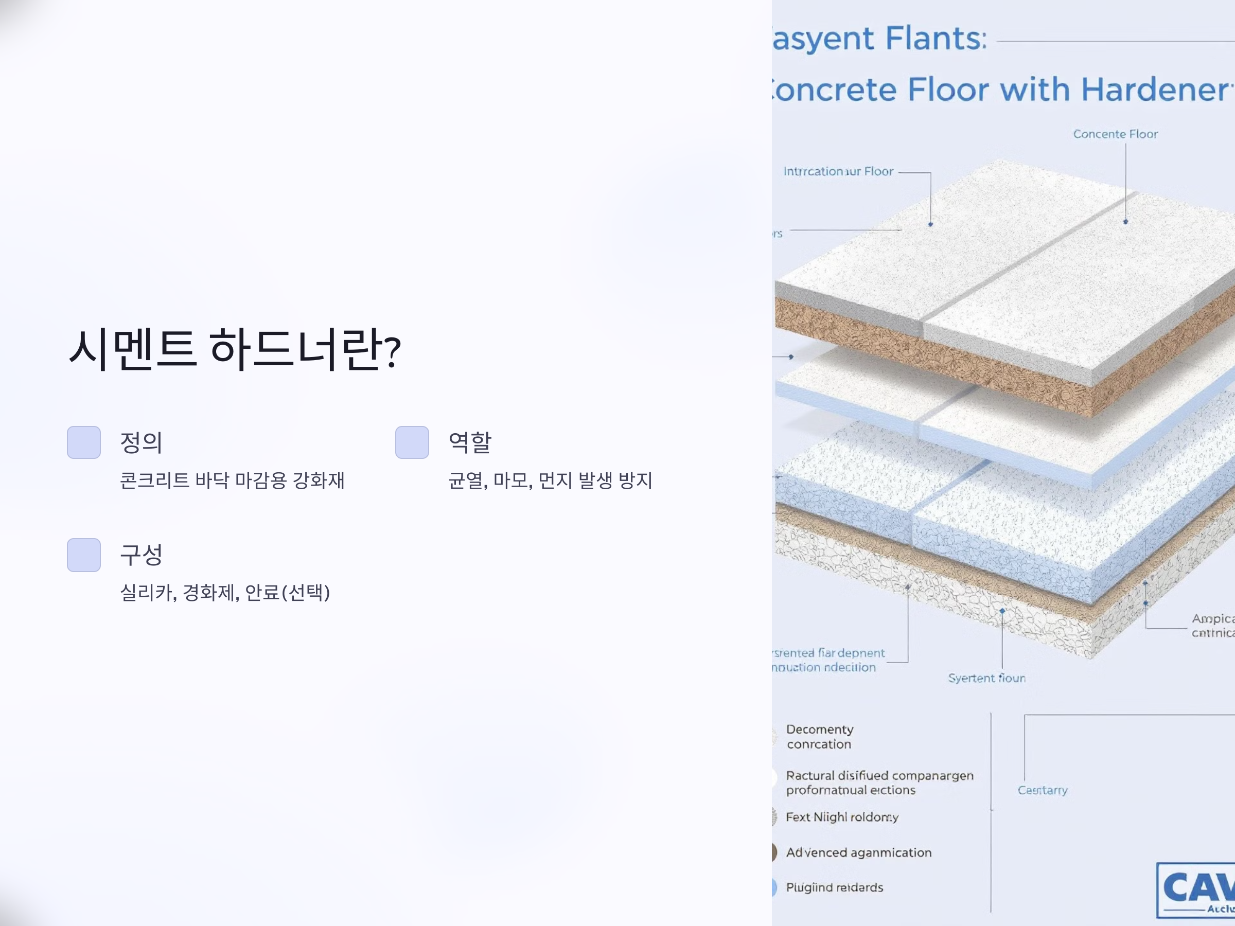 - 경화제: 화학적 반응을 통해 바닥을 단단하게 만듭니다.