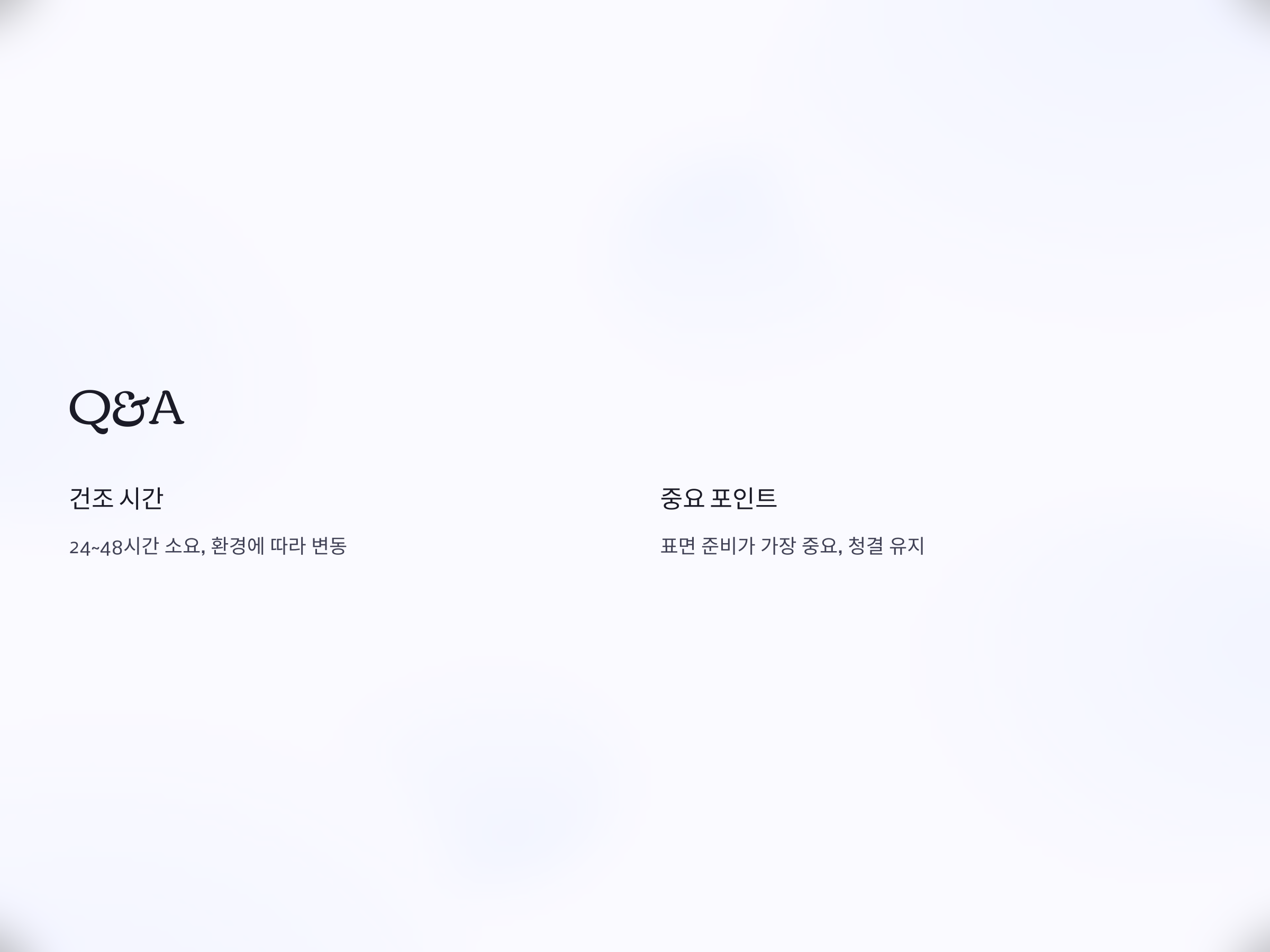 A: 표면 준비가 가장 중요합니다. 먼지와 기름기를 완벽히 제거하고 평탄한 상태를 유지해야 하드너가 제대로 작용합니다.