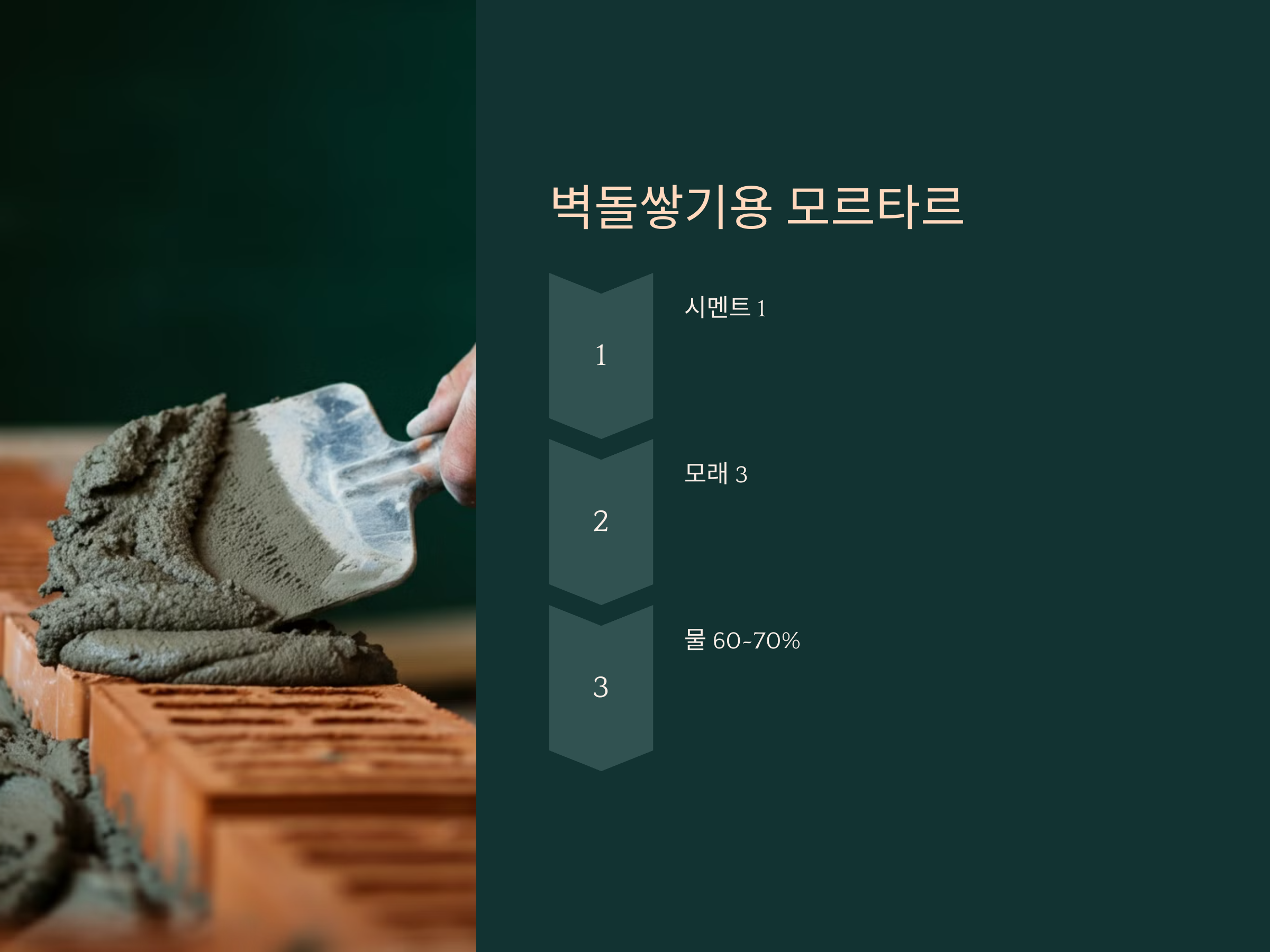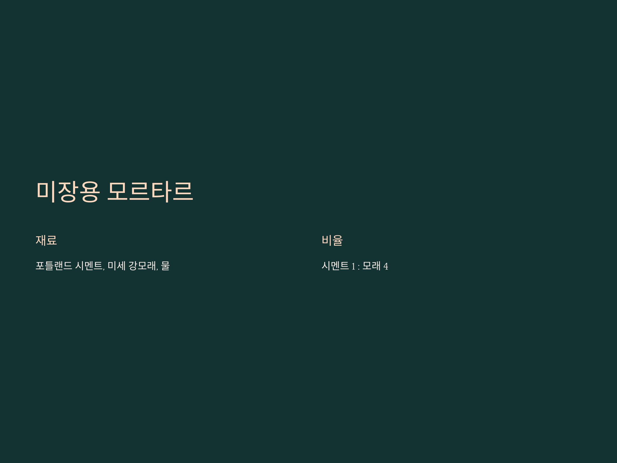 - 사용 재료: 포틀랜드 시멘트, 미세한 강모래, 물.