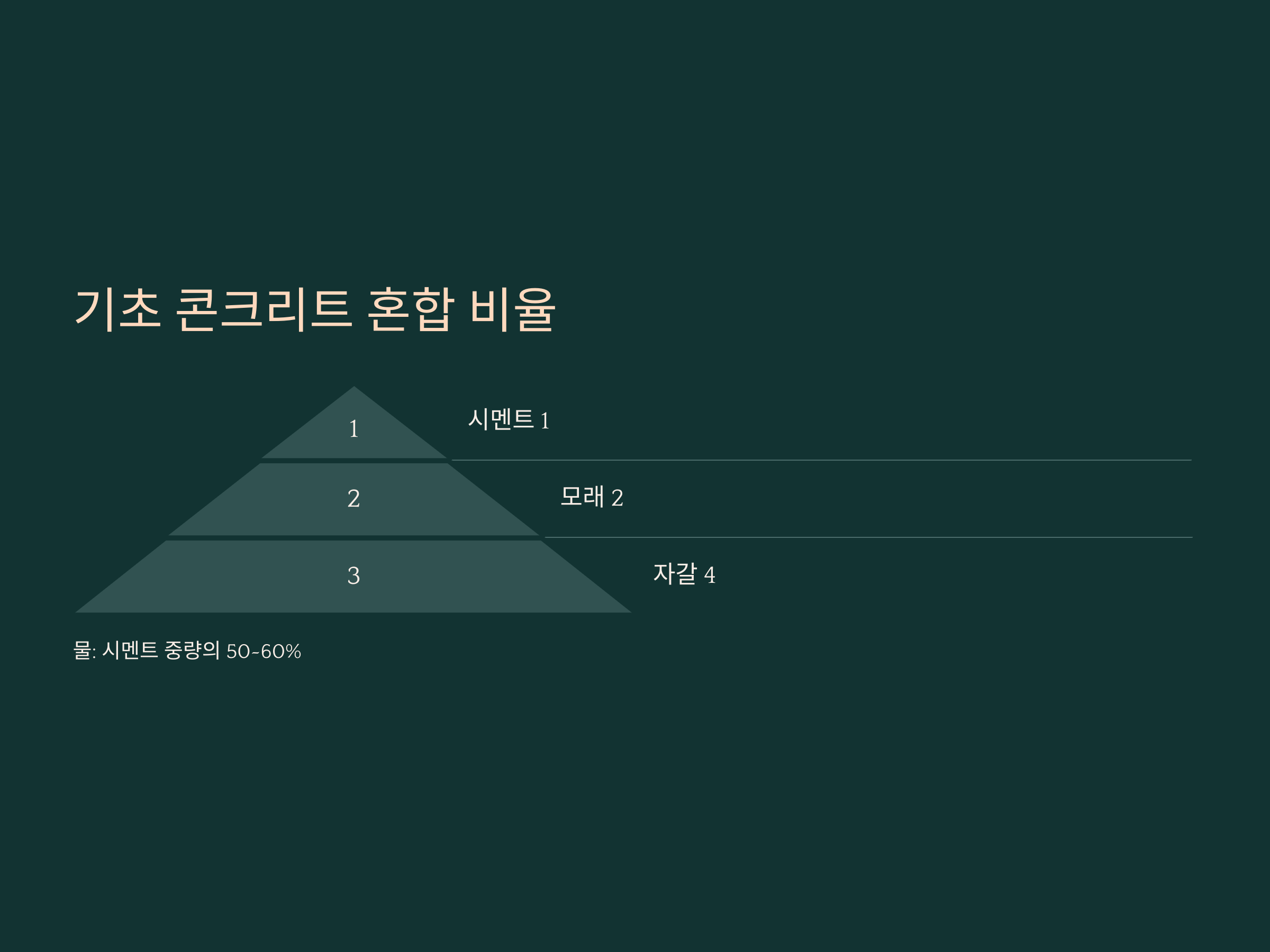 기초 콘크리트는 건축물의 무게를 지탱하는 중요한 역할을 합니다. 따라서 강도가 매우 중요하며, 일반적으로 1:2:4의 비율이 사용됩니다. 이 비율은 시멘트 1, 모래 2, 자갈 4의 비율을 의미합니다.