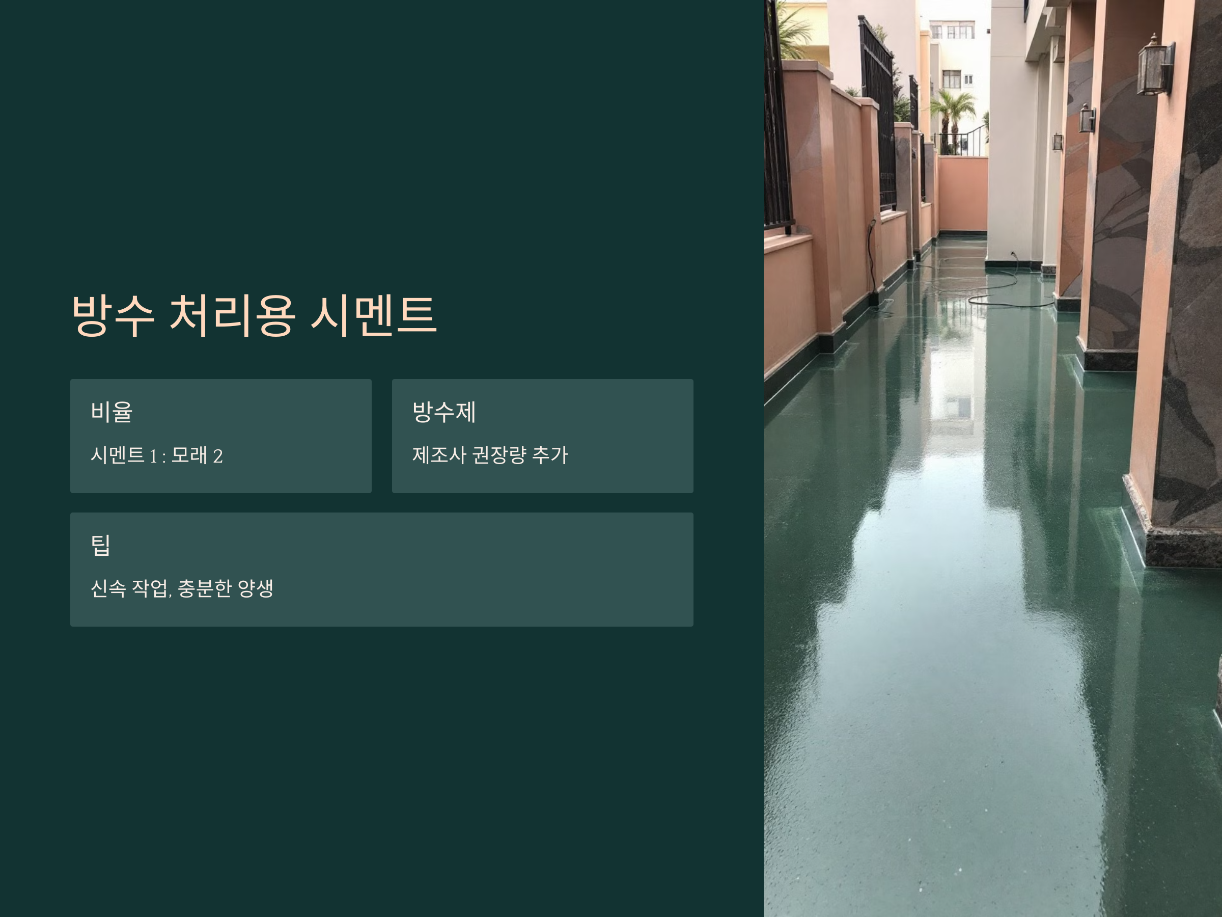 - 사용 재료: 방수제 첨가된 포틀랜드 시멘트, 미세한 강모래, 물.