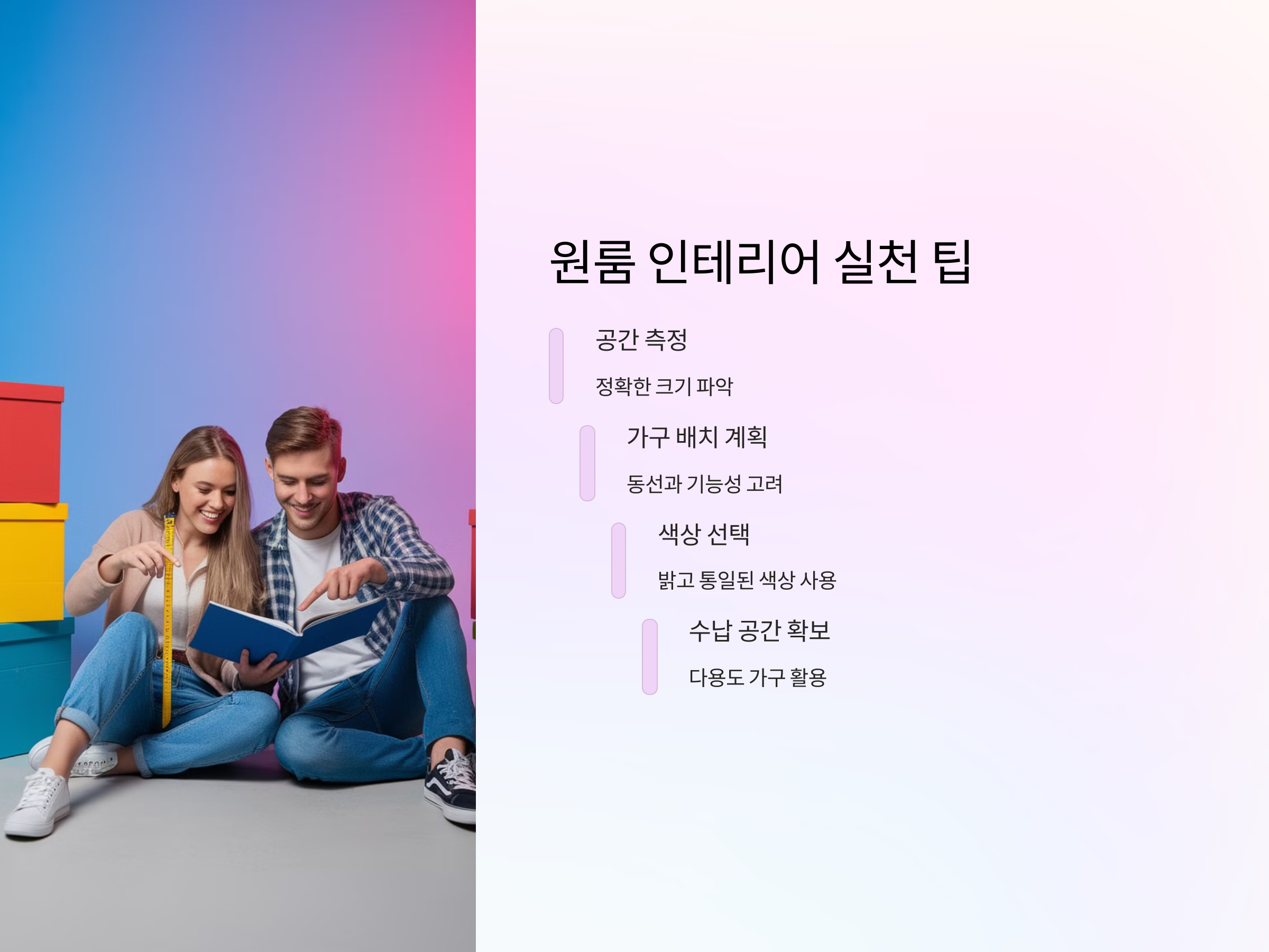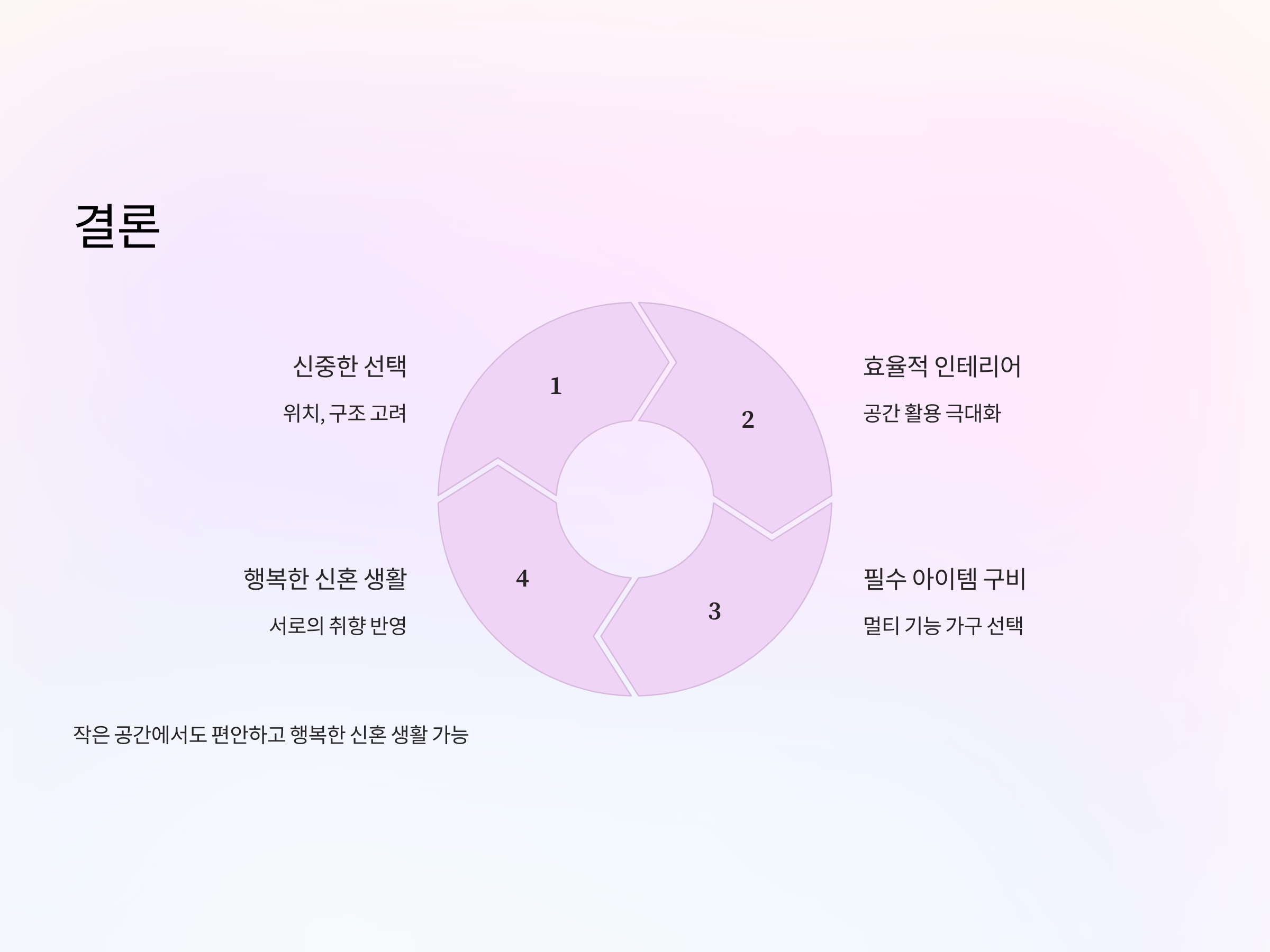 원룸은 신혼부부에게 경제적이면서도 아늑한 첫 보금자리가 될 수 있습니다. 공간 선택 시 신중한 고려와 효율적인 인테리어를 통해 작은 공간에서도 편안하고 행복한 신혼 생활을 즐길 수 있습니다. 서로의 생활 패턴과 취향을 반영한 공간을 만들어보세요.