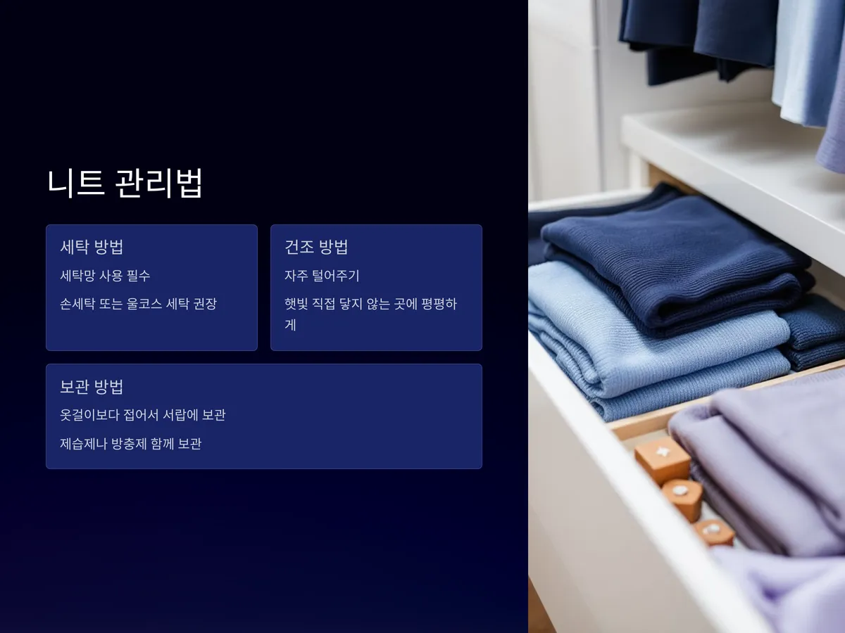 보관 시에는 옷걸이보다는 접어서 서랍이나 수납함에 보관하는 것이 옷의 형태를 유지하는 데 효과적입니다. 또한, 니트 사이에 제습제나 방충제를 넣어주면 장기간 보관에도 안전합니다. 이런 작은 팁 하나만으로도 니트의 형태와 질감을 오래 유지할 수 있습니