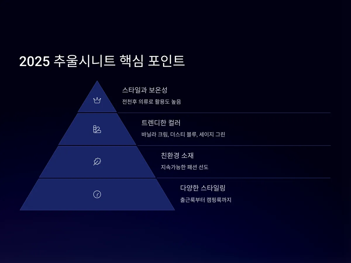 하나의 아이템으로 다양한 스타일을 연출할 수 있다면, 그만큼 비용 대비 만족도도 올라갑니다. 출근길에는 슬랙스와 레더슈즈에 매치해 깔끔한 오피스룩으로, 주말에는 조거 팬츠나 스커트와 함께 캠핑룩으로도 변신 가능한 아이템이 바로 추울시니트입니다.