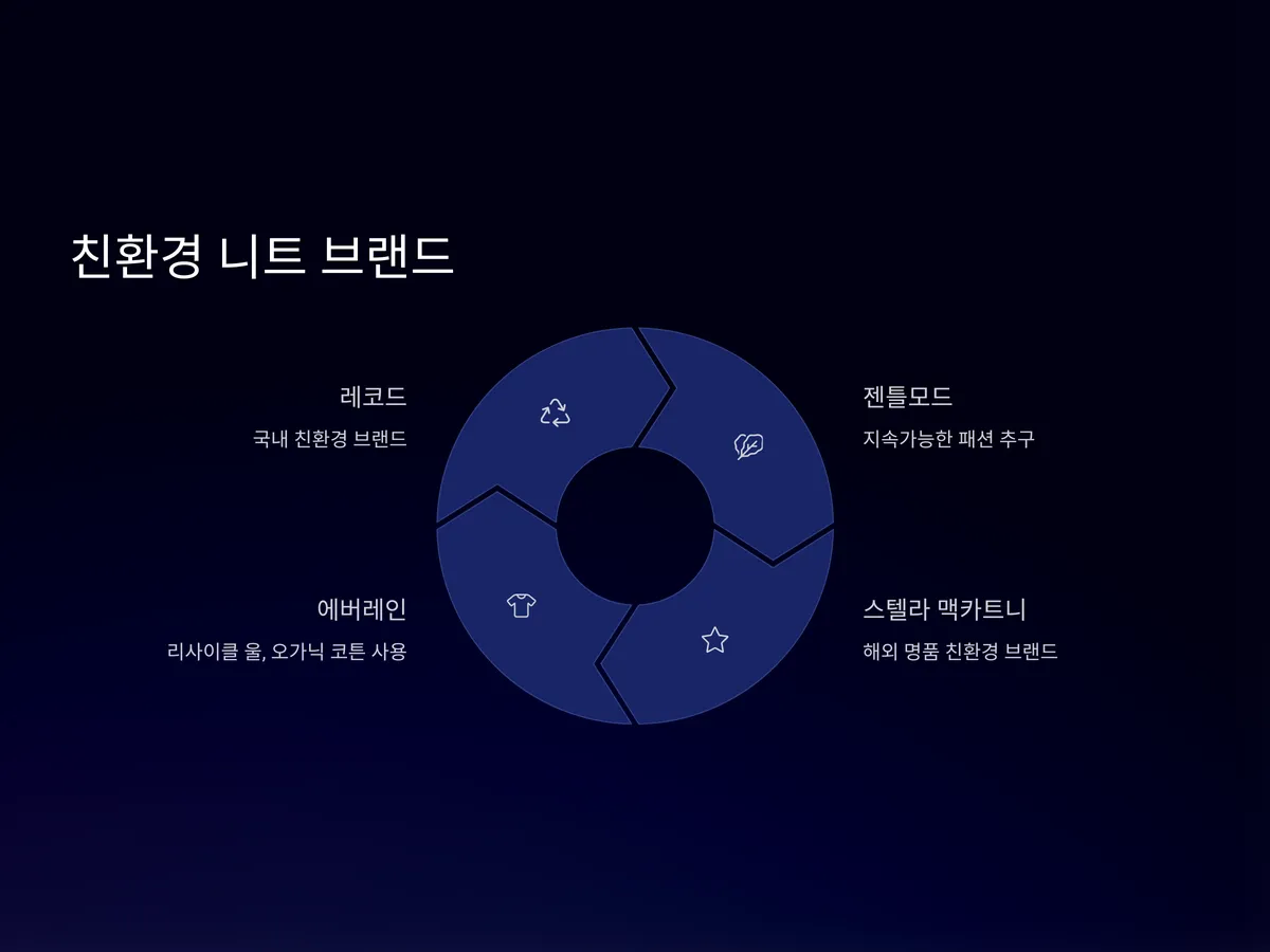지속 가능한 패션에 대한 관심이 높아지면서, 친환경 소재를 사용하는 니트 브랜드가 주목받고 있습니다. 국내 브랜드 ‘레코드(RE;CODE)’, ‘젠틀모드(GENTLEMODE)’, 해외 브랜드로는 ‘스텔라 맥카트니(Stella McCartney)’, ‘에버레인(Everlane)’ 등이 대표적입니다.