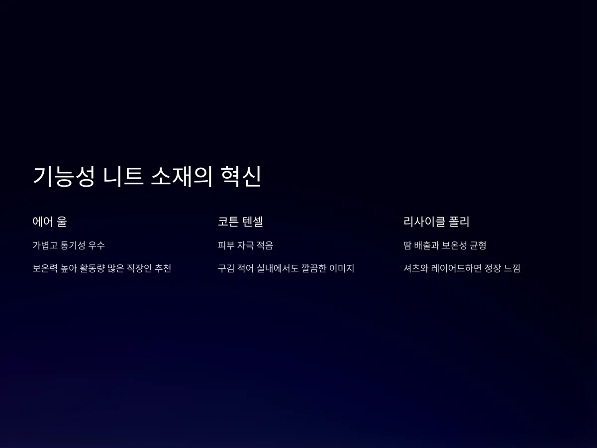 또한, 기능성 니트는 장시간 착용에도 피부 자극이 적고, 구김이 적어 실내에서도 깔끔한 이미지를 유지할 수 있습니다. 셔츠와 함께 레이어드하면 정장 느낌도 살릴 수 있어 남녀 모두 활용도가 매우 높습니다.