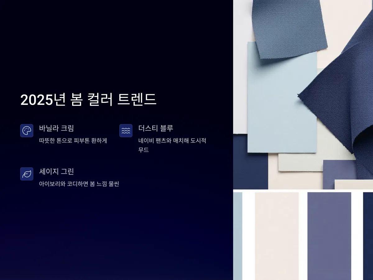 2025년 봄 컬러 트렌드는 자연에서 영감을 받은 ‘바닐라 크림’, ‘더스티 블루’, ‘세이지 그린’ 계열이 대세입니다. 이 컬러들은 따뜻한 톤으로 피부톤을 환하게 만들어주며, 실내외 구분 없이 착용 가능해 데일리 아이템으로 제격입니다. 특히 톤온톤 스타일링은 단조로워 보일 수 있는 니트 룩을 세련되게 바꿔주는 마법 같은 조합입니다.