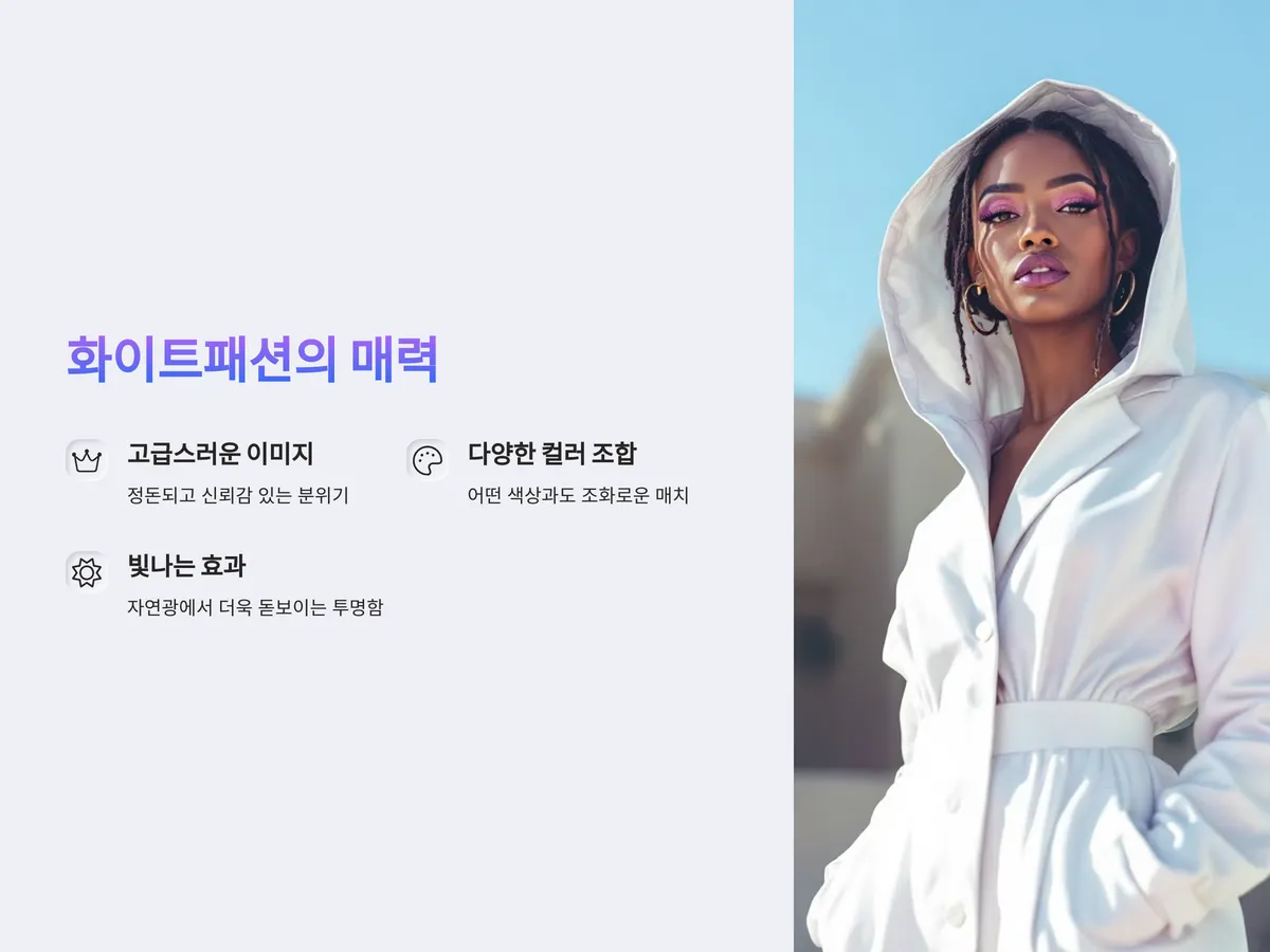 화이트는 단순히 깨끗한 느낌을 넘어서, 착용자의 이미지를 정돈되고 고급스럽게 만들어주는 힘이 있습니다. 특히 똑같은 디자인의 옷이라도 화이트 컬러는 더 깔끔하고 정제된 분위기를 연출합니다. 이런 특성 덕분에 면접, 발표, 중요한 회의 등에서 신뢰감을 주는 룩으로도 인기가 많습니다.