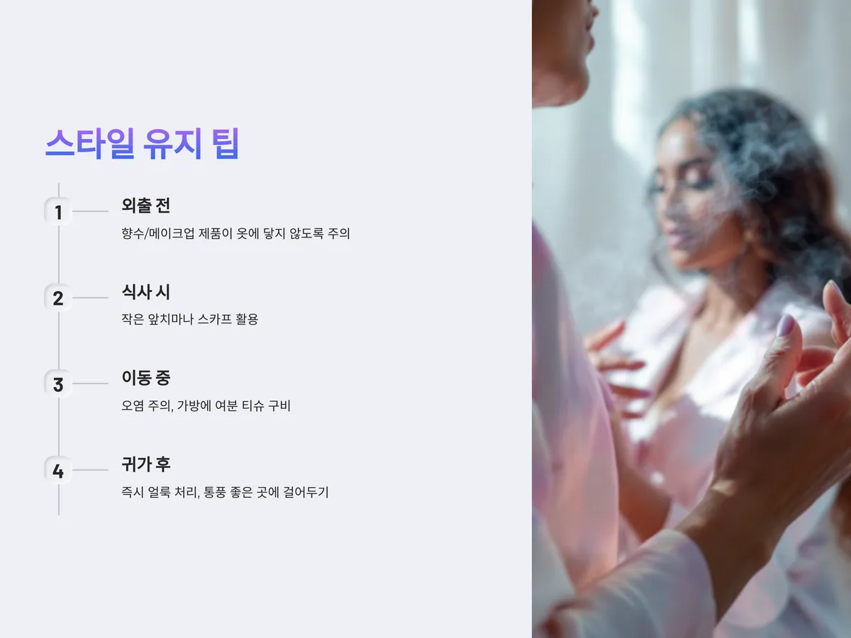 스타일을 유지하기 위해서는 보관 방법도 중요합니다. 밝은 컬러끼리 따로 보관하고, 통풍이 잘 되는 장소에 걸어두면 곰팡이나 누렇게 변하는 현상을 방지할 수 있습니다. 외출 전에는 향수나 메이크업 제품이 옷에 닿지 않도록 주의하고, 식사 시에는 작은 앞치마나 스카프를 활용하는 것도 좋은 방법입니다.