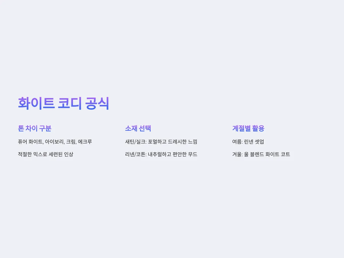 화이트패션에서 가장 중요한 요소 중 하나는 '톤 차이 구분'입니다. 같은 화이트라도 퓨어 화이트, 아이보리, 크림, 에크루 등 미묘한 차이가 있습니다. 이들을 적절히 믹스하면 단조롭지 않으면서도 세련된 인상을 줄 수 있지만, 무작정 섞으면 촌스러워 보일 수 있습니다. 특히 톤온톤 스타일링이 유행하는 만큼 톤 정리는 필수입니다.