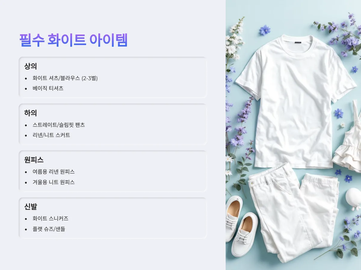 화이트 스커트와 원피스는 여성스러운 무드를 완성해주는 핵심 아이템이며, 여름에는 리넨 소재, 겨울에는 니트 소재로 구비하면 계절별로 활용할 수 있습니다. 마지막으로 화이트 스니커즈나 플랫 슈즈, 샌들은 실용성과 패션성을 모두 잡을 수 있는 선택입니다. 스타일에 따라 스퀘어토, 둥근코 등 디테일을 고려해 보세요.