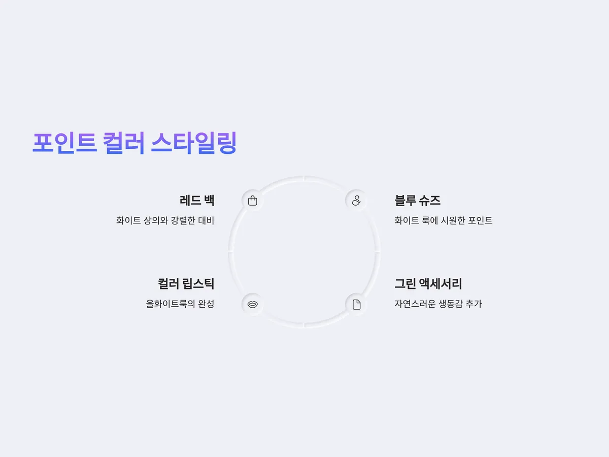 화이트 스타일링에서 또 하나 중요한 포인트는 보색을 활용한 포인트 컬러 연출입니다. 화이트는 어떤 색과도 잘 어울리므로 포인트 컬러만 잘 선택해도 전체적인 코디에 생동감을 더할 수 있습니다. 대표적으로 블루, 레드, 그린 등의 원색 계열은 화이트와 함께 할 때 더욱 돋보이며, 한두 가지 아이템만으로도 확실한 포인트가 됩니다.