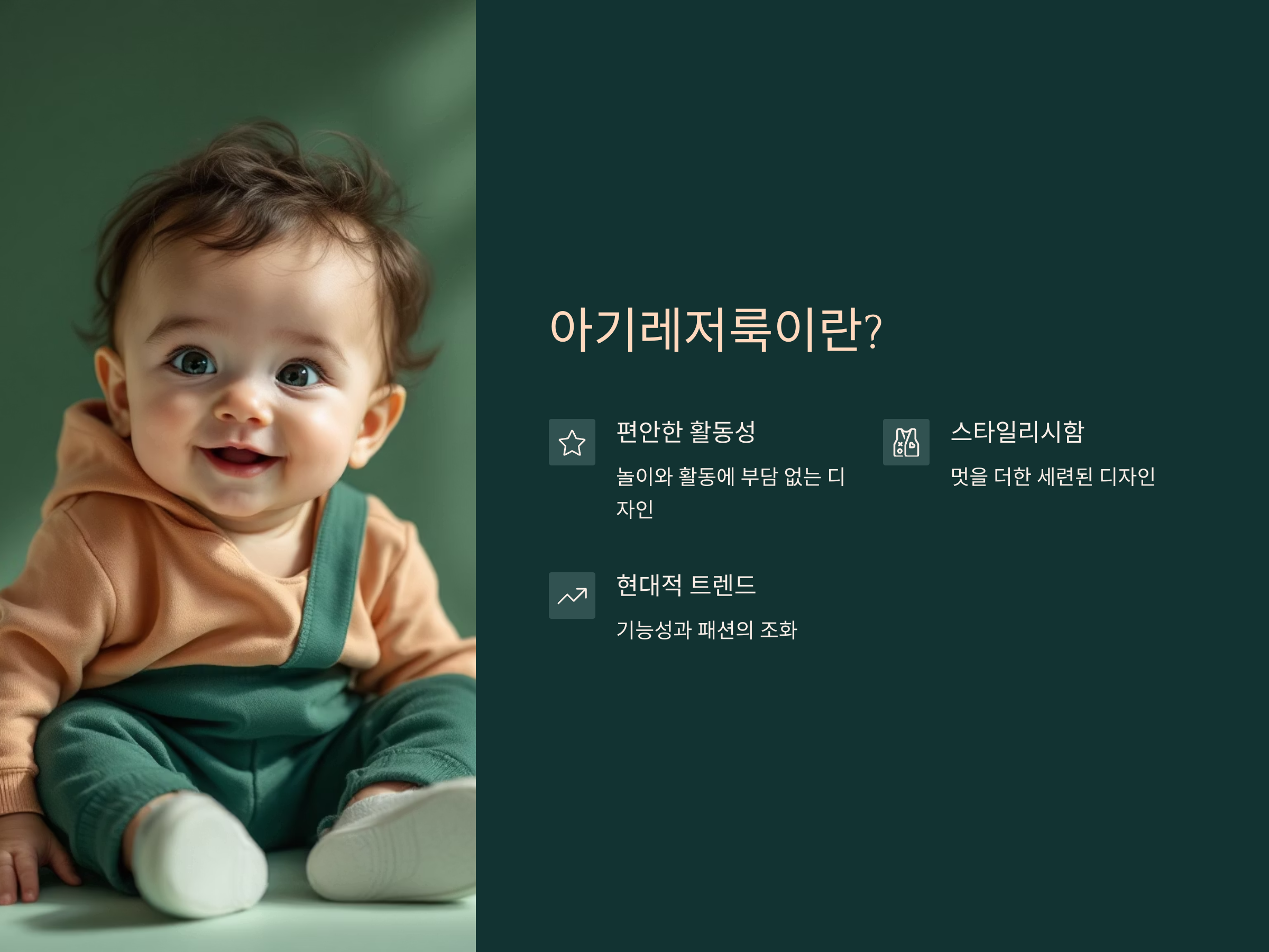 아기레저룩은 최근 패션 트렌드 중 가장 인기를 끌고 있는 스타일 중 하나로, 아기들에게 활동적인 라이프스타일을 제공하면서도 편안하고 스타일리시한 옷을 입힐 수 있는 방법입니다. 이 스타일은 단순히 아기들의 운동복이 아니라, 아기들이 활동을 하거나 야외에서 놀 때에도 멋지게 보이도록 해줍니다. 2025년 아기레저룩은 기능성에 스타일을 더한 혁신적인 디자인이 주요 특징으로, 아기와 부모 모두 만족할 수 있는 다양한 선택지를 제공합니다.