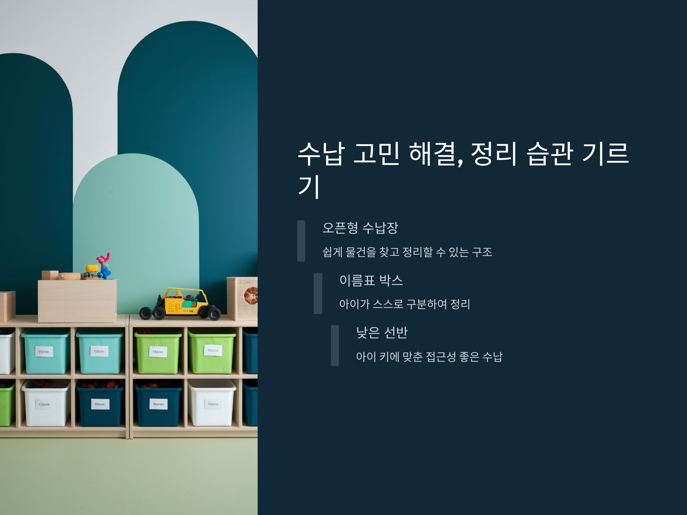 아이 방은 장난감, 책, 옷 등 물건이 많아 쉽게 어질러질 수 있습니다. 효율적인 수납 솔루션을 통해 아이가 스스로 정리하는 습관을 들이는 것이 중요합니다. 오픈형 수납장, 이름표가 붙은 박스, 낮은 높이의 선반 등을 활용해 아이가 직접 정리할 수 있는 구조를 만드는 것이 핵심입니다. 요즘은 인테리어와 조화를 이루는 디자인 수납장도 많아 방의 분위기까지 살릴 수 있습니다.