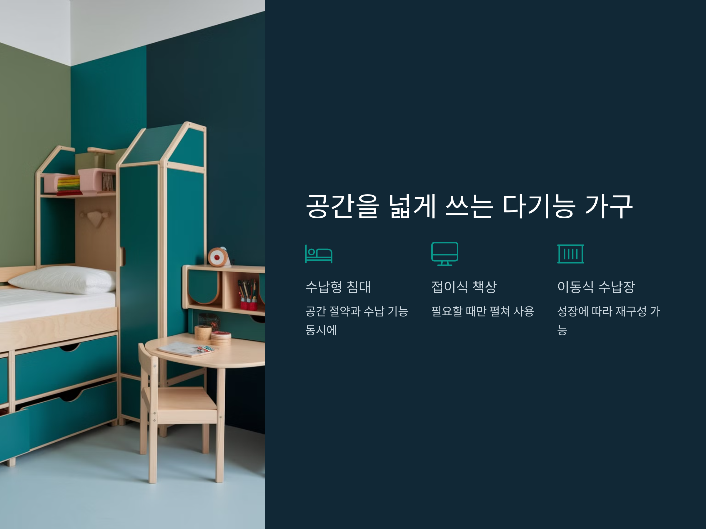 좁은 공간에서도 효율적으로 사용할 수 있는 다기능 가구는 키즈룸 인테리어에서 빠질 수 없습니다. 수납 기능을 겸한 침대, 접이식 책상, 이동식 수납장 등은 아이가 자라면서 변하는 용도에 맞게 활용도가 높습니다. 특히, 성장에 따라 공간을 재구성하기 쉬워 유지비용 절감에도 도움이 됩니다. 이런 가구는 아이가 스스로 정리하는 습관을 기를 수 있도록 도와주는 장점도 있습니다.