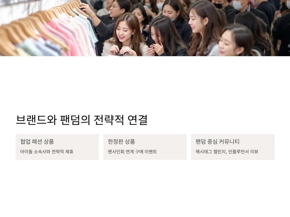 최근에는 아이돌 굿즈를 넘어, 협업 패션 상품이 메인 수익 모델로 부상하고 있습니다. 박람회에 참가한 브랜드들은 유명 아이돌 소속사와 전략적으로 제휴하여, 박람회 한정판 상품을 출시하거나 팬사인회와 연계된 구매 이벤트를 진행하고 있습니다. 이러한 방식은 제품 판매율을 비약적으로 끌어올릴 뿐 아니라 브랜드 인지도 제고에도 큰 효과를 발휘하고 있죠.