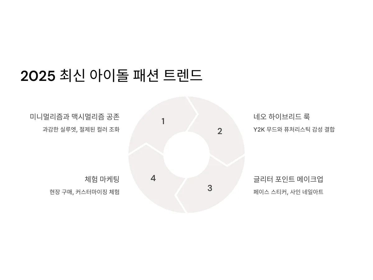 2025년 박람회의 가장 강력한 테마는 바로 '미니멀리즘과 맥시멀리즘의 공존'입니다. 뉴진스, 르세라핌, 스트레이키즈 등 인기 그룹의 스타일링에서 볼 수 있듯, 과감한 실루엣과 절제된 컬러가 조화롭게 어우러지는 것이 특징입니다. 여기에 Y2K 무드와 퓨처리스틱 감성이 결합된 ‘네오 하이브리드’ 룩이 대세로 부상하고 있습니다.