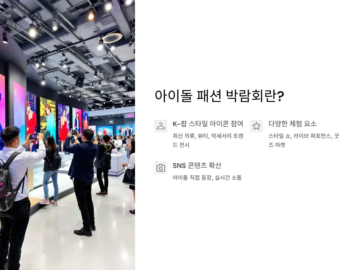 아이돌패션 박람회는 K-팝 산업의 스타일 아이콘들이 참여하여 최신 의류 브랜드, 뷰티 제품, 악세서리 및 메이크업 트렌드를 직접 선보이는 대규모 전시 행사입니다. 연예기획사와 협업한 한정판 의상부터, 신진 디자이너의 독특한 스타일까지 만나볼 수 있어 업계 관계자들뿐만 아니라 일반 팬들까지 폭넓게 참여합니다.