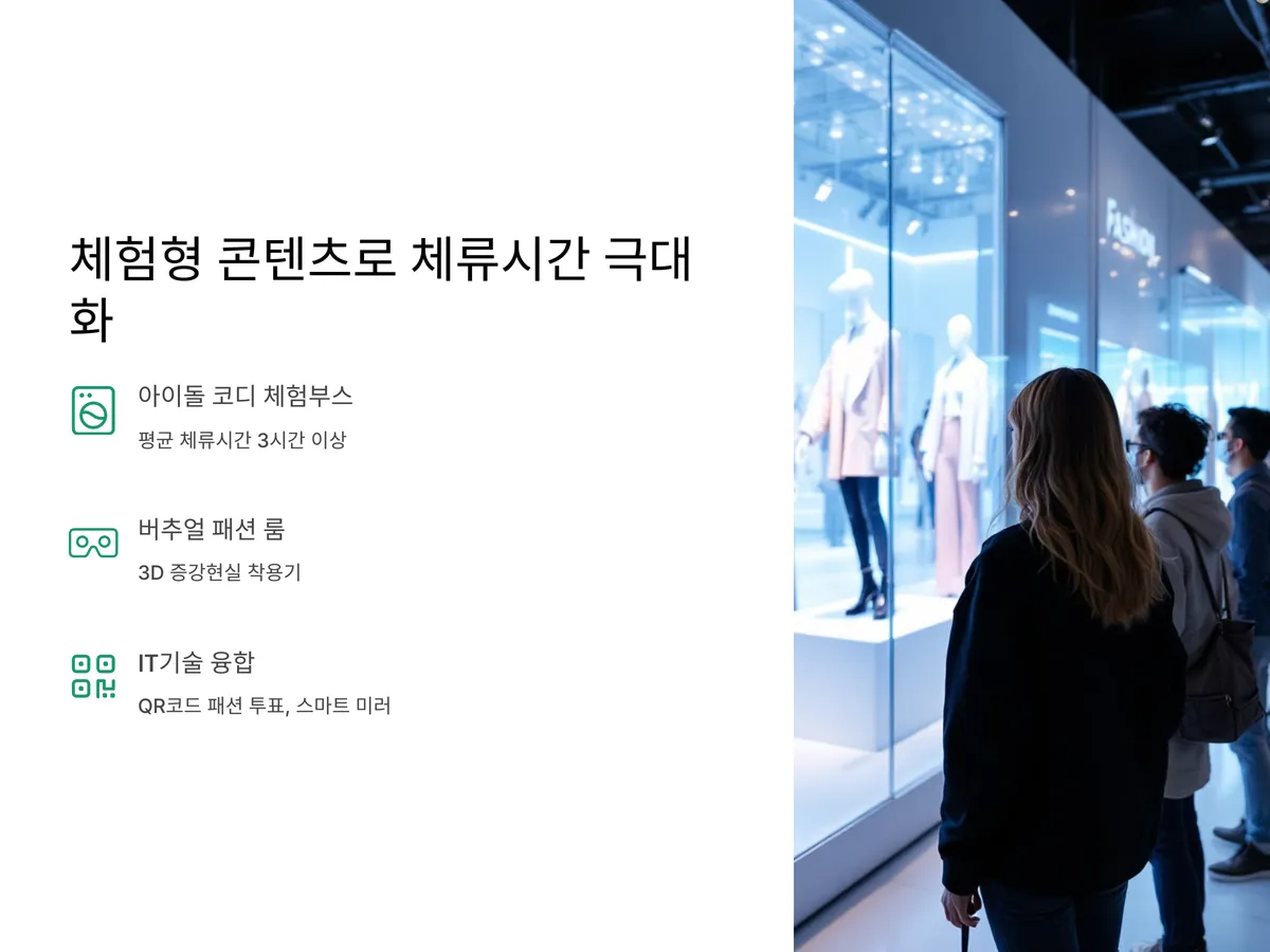 박람회 현장에는 다양한 체험형 콘텐츠가 준비되어 있어 방문자들의 평균 체류시간이 3시간 이상으로 측정되고 있습니다. 대표적으로는 '아이돌 코디 체험부스', '버추얼 패션 룸', '3D 증강현실 착용기' 등이 있으며, 각 부스는 인증샷 이벤트나 SNS 해시태그 이벤트와 연동되어 자연스러운 콘텐츠 확산을 유도합니다.