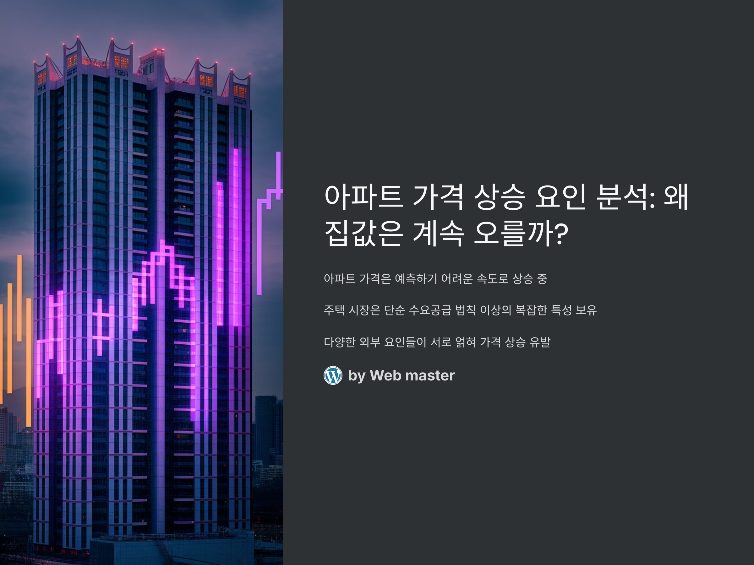 아파트 가격 상승은 언제나 많은 사람들의 관심을 끌고 있는 주제입니다. 특히, 최근 몇 년간 아파트 가격은 예측하기 어려운 속도로 상승해왔습니다. 그렇다면 과연 아파트 가격 상승에는 어떤 요인들이 작용하고 있을까요? 본 글에서는 아파트 가격 상승의 주요 요인과 그에 따른 영향에 대해 심도 깊게 분석해보겠습니다.