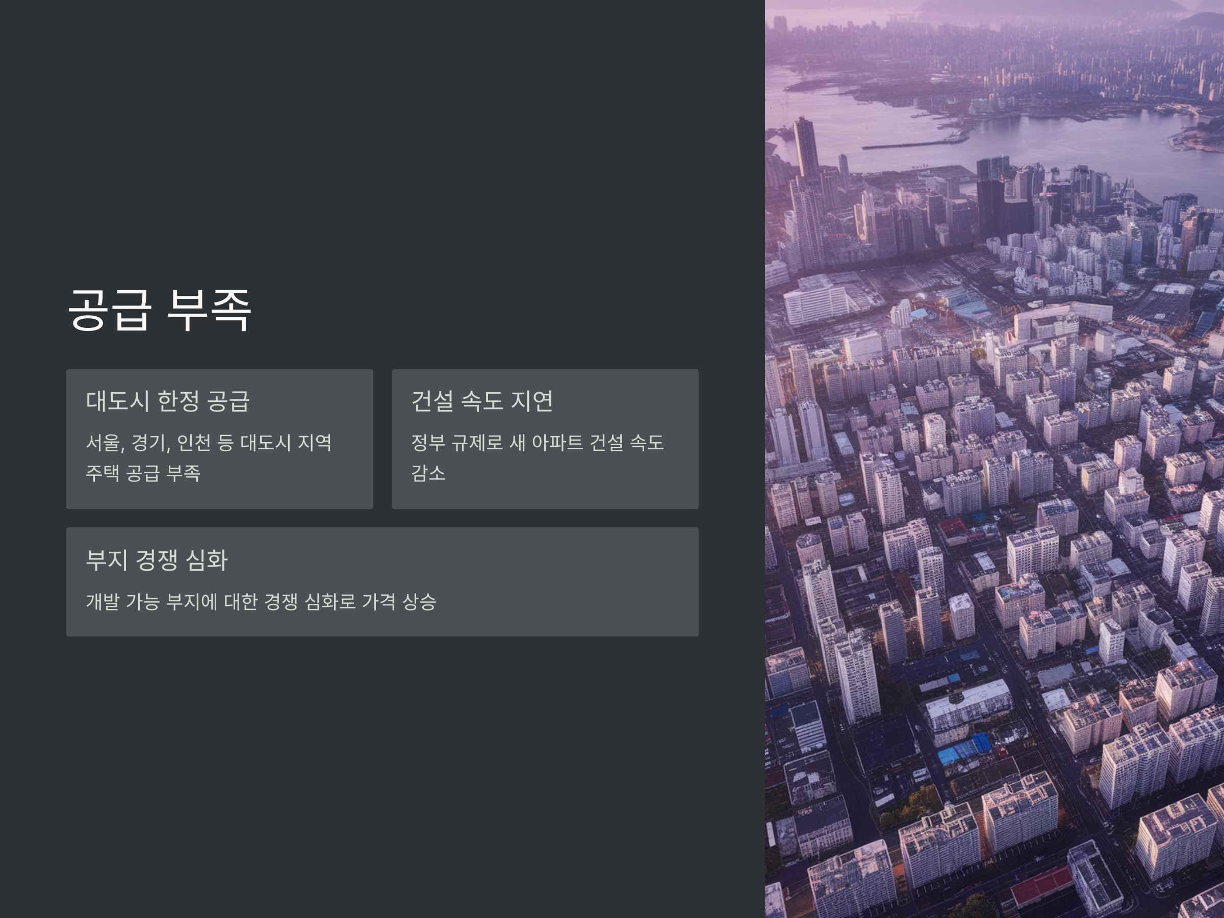 주택 시장에서 공급은 매우 중요한 요소로 작용합니다. 특히 대도시 지역에서는 주택 공급이 부족해지면 수요가 넘쳐나게 되어 가격이 급격히 상승합니다. 서울, 경기, 인천 등 대도시 지역에서는 이미 주택 공급이 한정적인 상황에서 정부의 재개발, 재건축 등의 규제로 인해 새로운 아파트가 건설되는 속도가 늦어지고 있습니다.