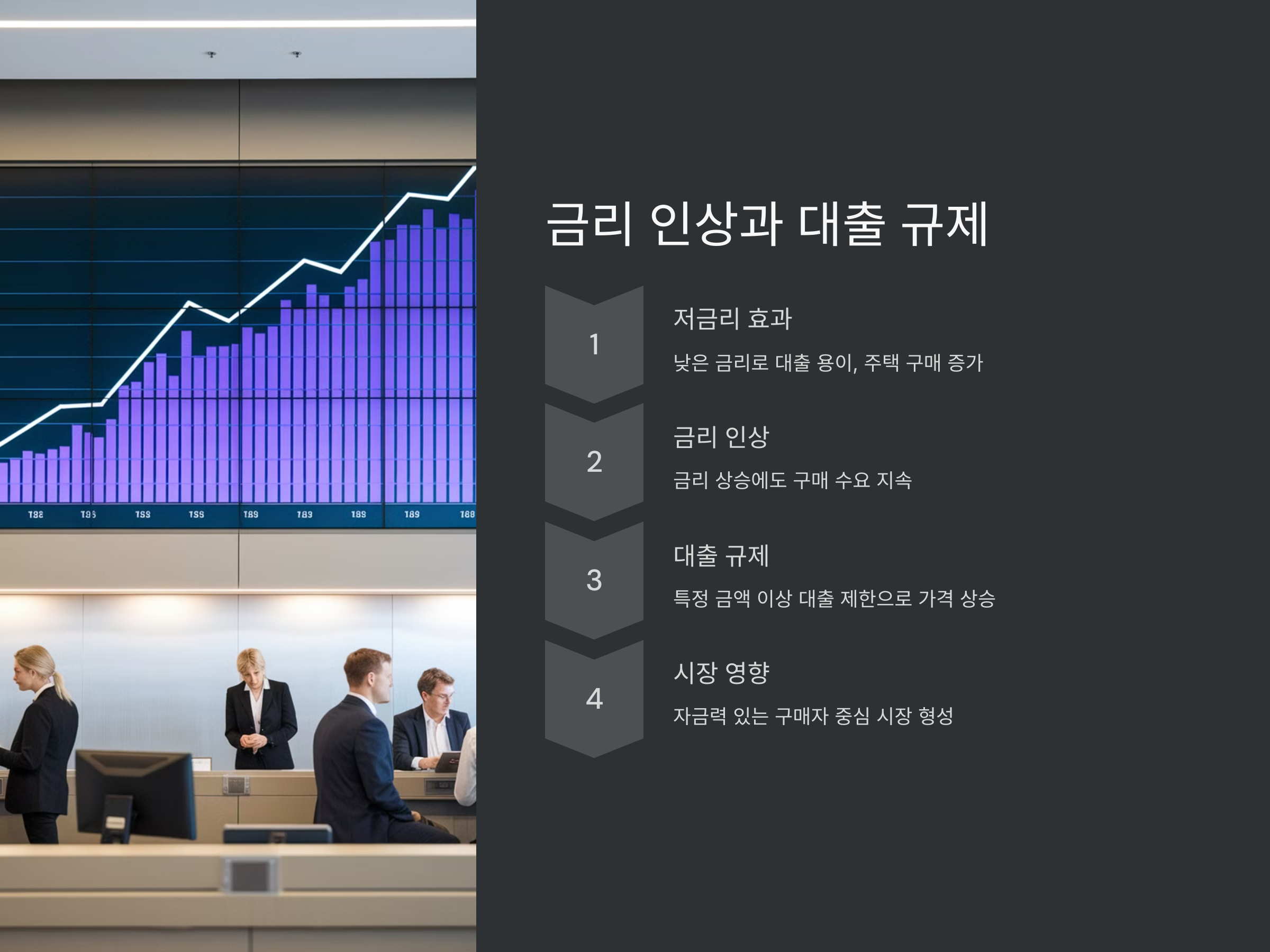 금리는 주택 구매자들에게 중요한 요소입니다. 금리가 낮을수록 대출이 용이해지므로 주택을 구매하는 사람들이 많아지고, 이는 가격 상승을 촉진합니다. 반대로 금리가 상승하면 대출이 어려워지고, 수요가 줄어들게 되어 가격이 안정되거나 하락할 가능성이 커집니다.