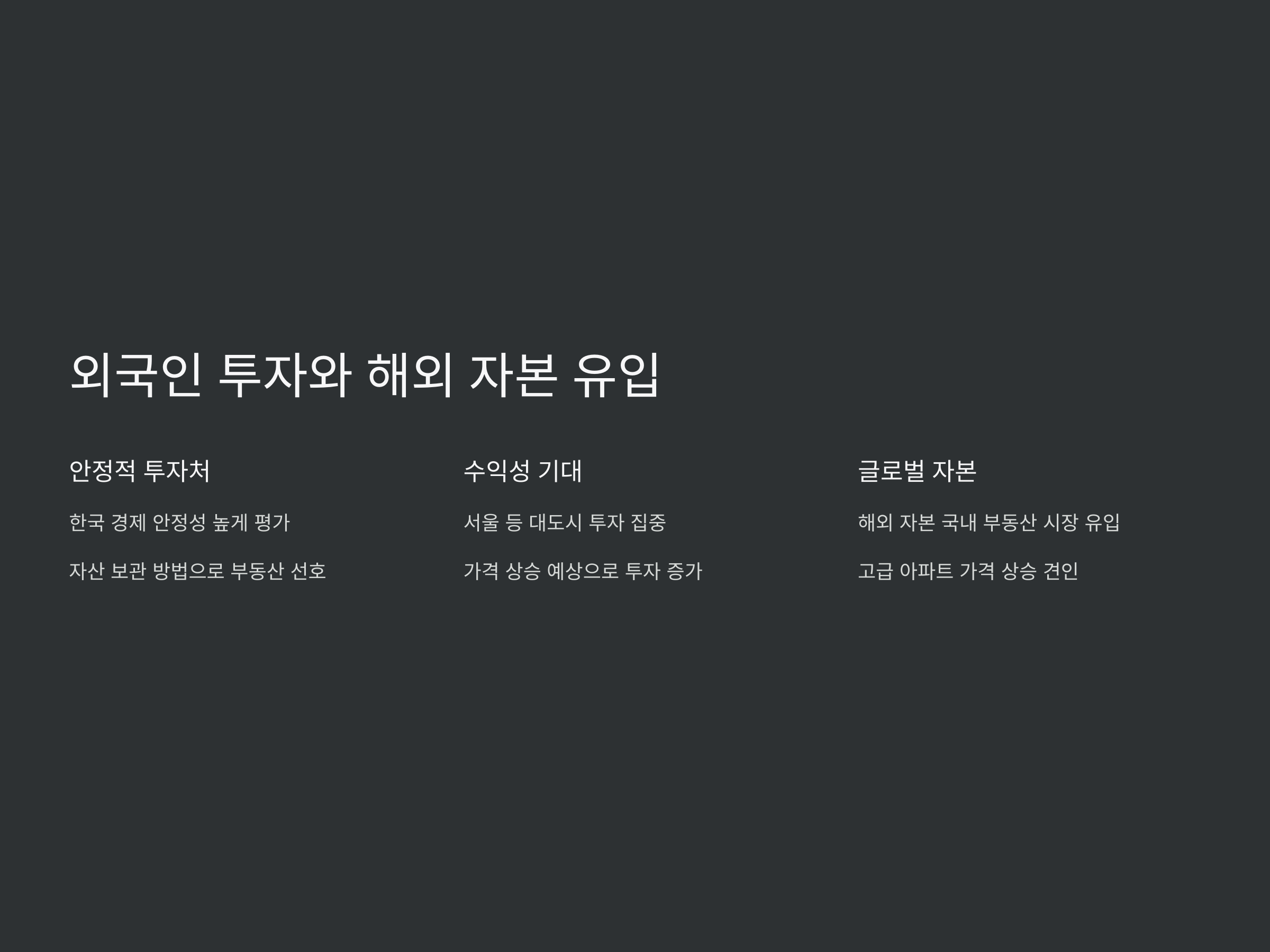 이러한 외국인들의 수요가 몰리면, 해당 지역의 아파트 가격은 자연스럽게 상승하게 됩니다. 또한, 글로벌 경제의 변화에 따라 해외 자본이 국내 부동산 시장에 유입되면서 가격 상승을 부추기는 경향도 있습니다.