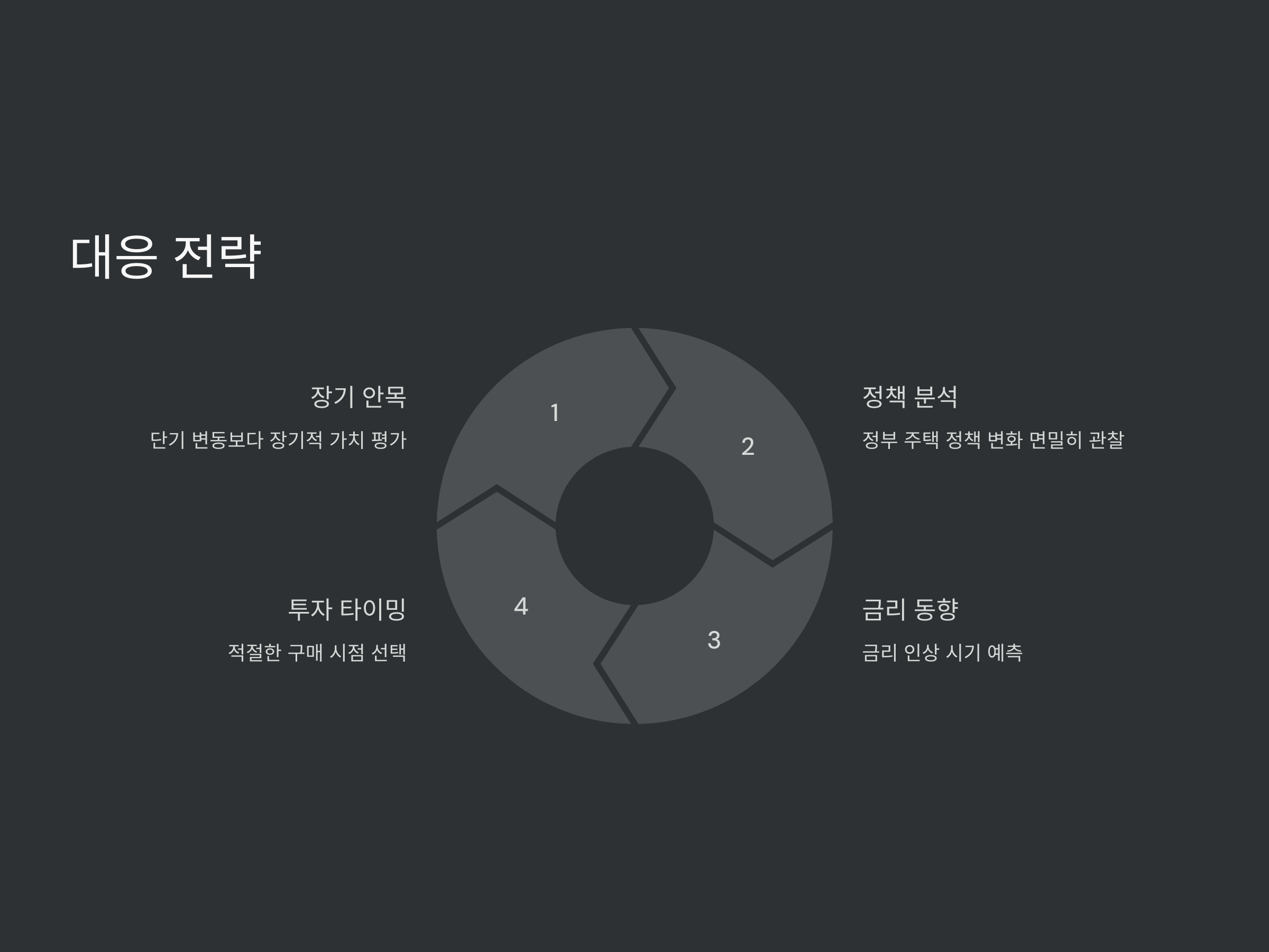 그렇다면, 이런 상황에서 어떻게 대응해야 할까요? 주택 구매를 고려하는 사람들은 장기적인 안목을 가지고 투자 결정을 내리는 것이 중요합니다. 또한, 정부의 정책 변화나 금리 인상 등의 요소를 면밀히 분석하여 시기적인 투자 타이밍을 선택하는 것도 중요합니다.