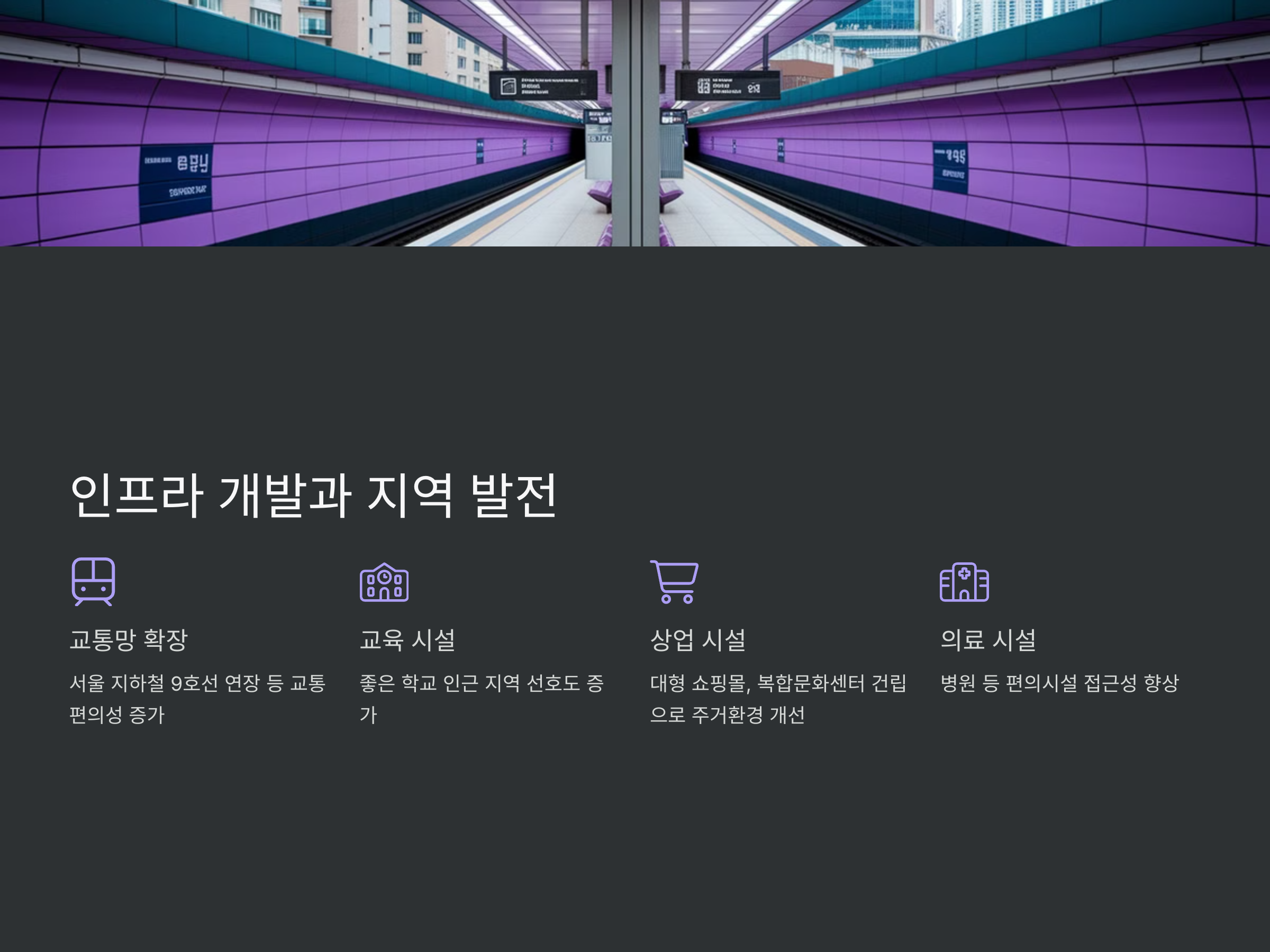 아파트 가격 상승에 영향을 미치는 또 다른 요인은 바로 지역 인프라 개발입니다. 대중교통, 학교, 병원, 상업시설 등의 인프라가 발전하는 지역은 많은 사람들이 선호하게 되며, 이는 해당 지역의 아파트 가격 상승을 이끌어냅니다. 특히, 서울 지하철 9호선의 연장과 같은 교통망 확장은 주변 아파트들의 가격을 크게 올리기도 했습니다.